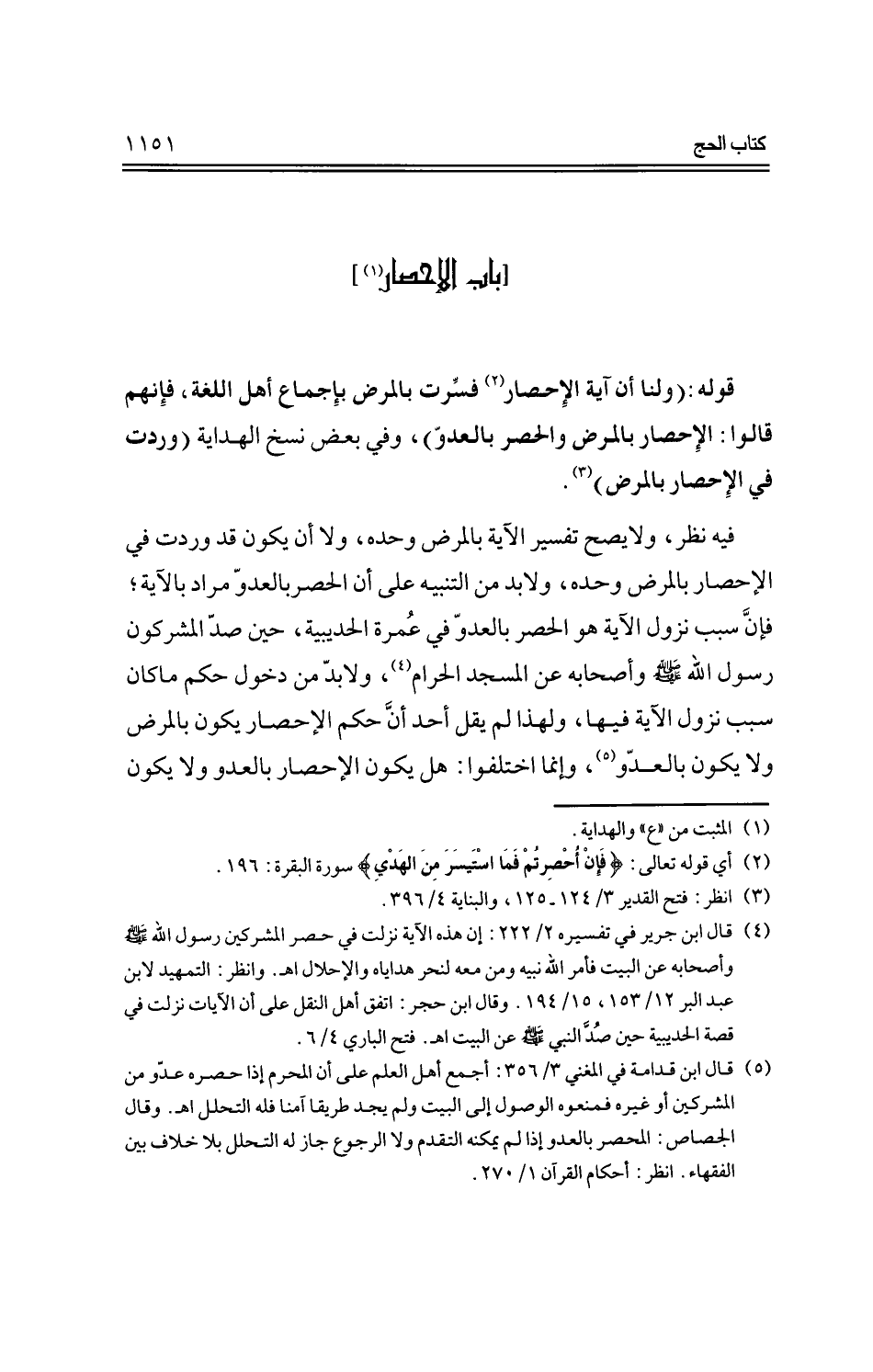فيه نظر، ولا يصح تفسير الآية بالمرض وحده، ولا أن يكون قد وردت في الإحصار بالمرض وحده، ولابد من التنبيه على أن الحصر بالعدو مراد بالآية؛ فإن سبب نزول الآية هو الحصر بالعدو في عمرة الحديبية، حين صد المشركون رسول الله -صلى الله عليه وسلم- وأصحابه عن المسجد الحرام، ولابد من دخول حكم ما كان سبب نزول الآية فيها، ولهذا لم يقل أحد أن حكم الإحصار يكون بالمرض ولا يكون بالعدو، وإنما اختلفوا: هل يكون الإحصار بالعدو ولا يكون
