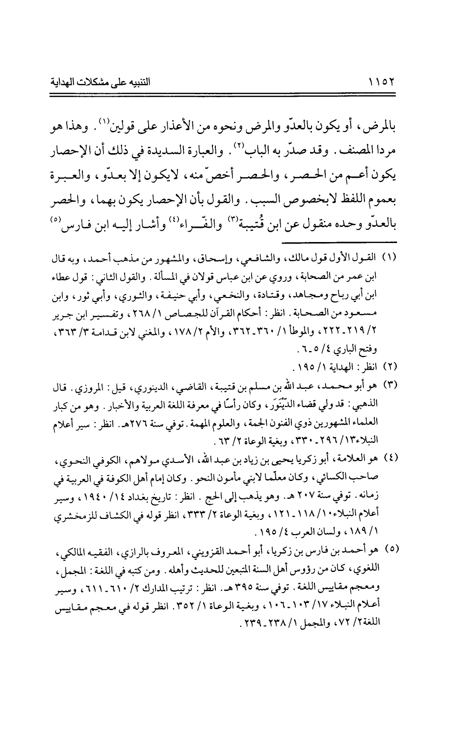 بالمرض، أو يكون بالعدو والمرض ونحوه من الأعذار على قولين. وهذا هو مردا المنصف. وقد صدر به الباب. والعبارة السديدة في ذلك أن الإحصار يكون أعم من الحصر، والحصر أخص منه، لا يكون إلا بعدو، والعبرة بعموم اللفظ لا بخصوص السبب. والقول بأن الإحصار يكون بهما، والحصر بالعدو وحده منقول عن ابن قتيبة والفراء وأشار إليه ابن فارس