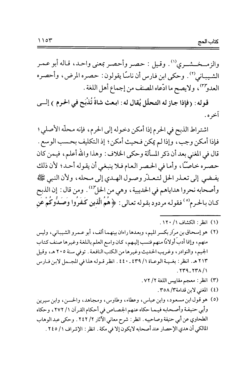 اشتراط الذبح في الحرم أذا أمكن دخوله إلى الحرم، فإنه محله الأصلي؛ فإذا أمكن وجب، وإذا لم يمكن فحيث أمكن؛ إذ التكليف بحسب الوسع. قال المغني بعد أن ذكر المسألة وحكى الخلاف: وهذا والله أعلم، فيمن كان حصره خاصًا، وأما في الحصر العام فلا ينبغي أن يقوله أحد؛ لأن ذلك يفضي إلى تعذر الحل لتعذر وصول الهدى إلى محله، وأن النبي -صلى الله عليه وسلم- وأصحابه نحروا هداياهم في الحديبية، وهي من الحل. ومن قال: إن الذبح كان بالحرم فقوله مردود بقوله -تعالى-: {هم الذين كفروا وصدوكم عن