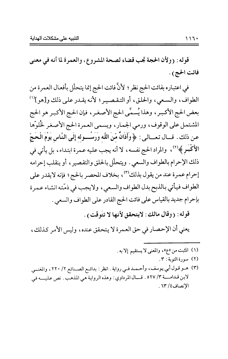 في اعتباره بفائت الحج نظر؛ لأن فائت الحج إنما يتحلل بأفعال العمرة من الطواف، والسعي، والحلق، أو التقصير؛ لأنه يقدر على ذلك و [هو] بعض الحج ألأكبر، وهذا يسمى الحج الأصغر، فإن الحج الأكبر هو الحج المشتمل على الوقوف، ورمي الجمار، ويسمى العمرة الحج الأصغر لخلوها عن ذلك. -قال تعالى-: {وأذان من الله ورسوله إلى الناس يوم الحج الأكبر}، والمراد الحج نفسه، لا أنه يجب عليه عمرة ابتداء، بل يأتي في ذلك الإحرام بالطواف والسعي. ويتحلل بالحلق والتقصير، أو ينقلب إحرامه إحرام عمرة عند من يقول بذلك، بخلاف المحصر بالحج؛ فإنه لا يقدر على إحرام عمرة عند من يقول بذلك، بخلاف المحصر بالحج؛ فإنه لا يقدر على الطواف فيأتي بالذبح بدل الطواف والسعي، ولا يجب في ذمته إنشاء عمرة بإحرام جديد بالقياس على فائت الحج القادر على الطواف والسعي.