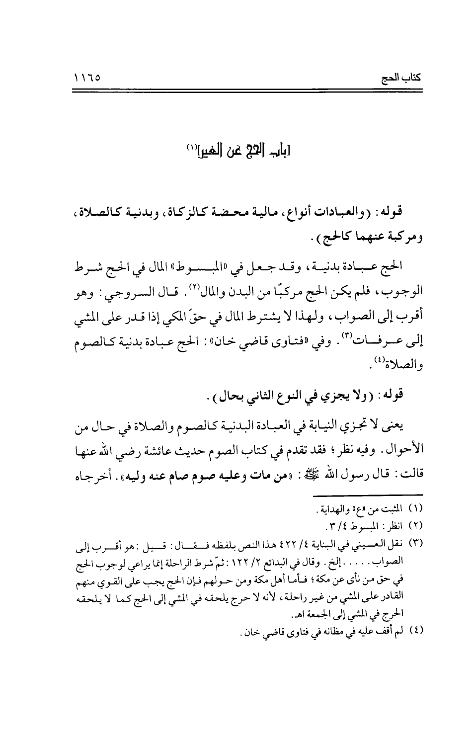 الحج عبارة بدنية، وقد جعل في ((المبسوط)) المال في الحج شرط الوجوب، فلم يكن الحج مركبًا من البدن والمال. قال السروجي: وهو أقرب إلى الصواب، ولهذا لا يشترط المال في حق المكي إذا قدر على المشي إلى عرفات. وفي ((فتاوى قاضي خان)): الحج عبادة بدنية كالصوم والصلاة.