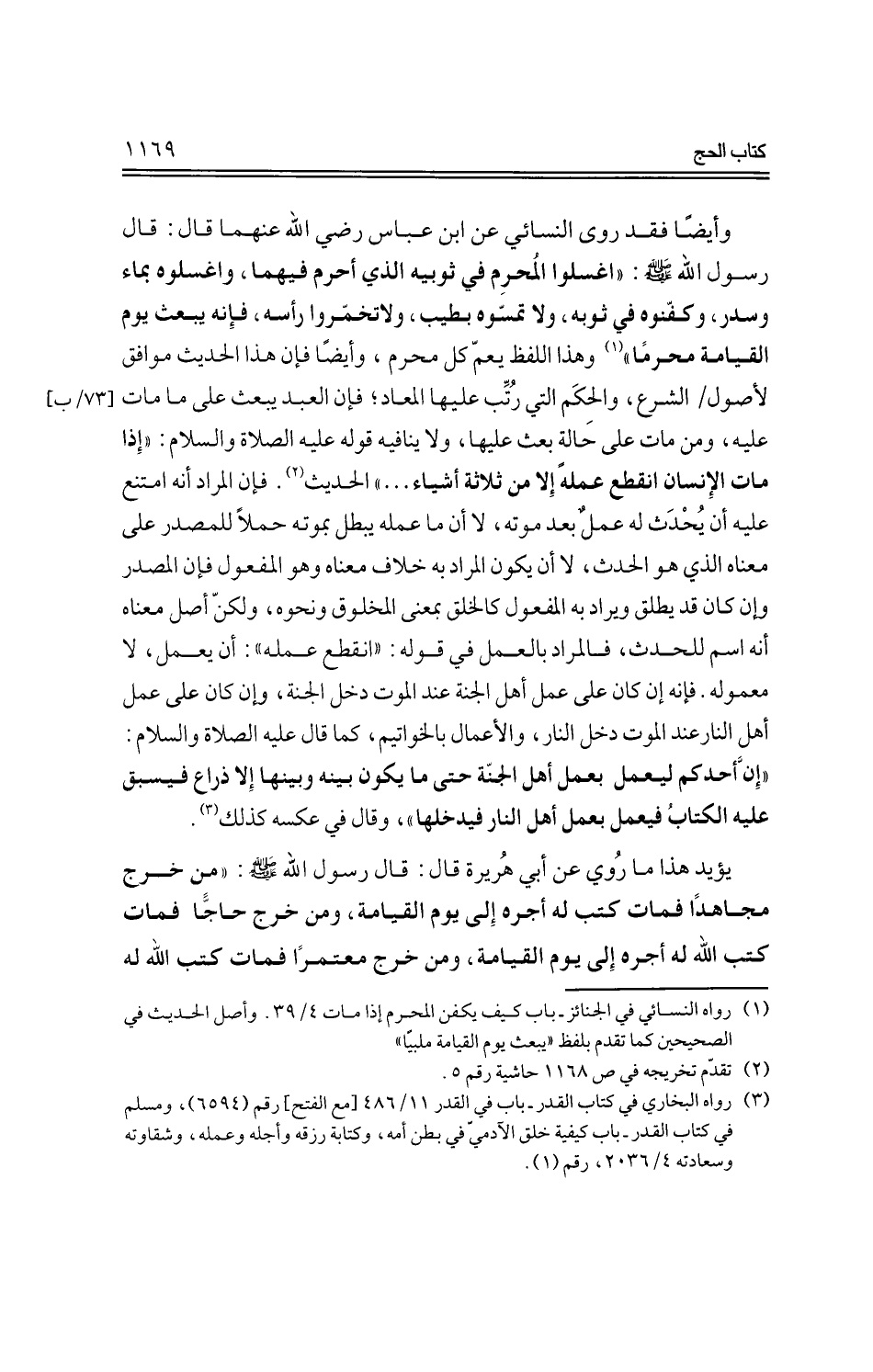 وأيضًا فقد روى النسائي عن ابن عباس -رضي الله عنهما- قال: قال رسول الله -صلى الله عليه وسلم-: ((اغسلوا المحرم في ثوبيه الذي أحرم فيهما، واغسلوه بماء وسدر، وكفنوه في ثوبه، ولا تمسوه بطيب، ولا تخمروا رأسه، فإنه يبعث يوم القيامة محرمًا)) وهذا اللفظ يعم كل محرم، وأيضًا فإن هذا الحديث موافق لأصول الشرع، والحكم التي رتب عليها المعاد؛ فإن العبد يبعث على ما مات عليه، ومن مات على حالة بعث عليها، ولا ينافيه قوله -عليه الصلاة السلام-: ((إذا مات الإنسان انقطع عمله إلا من ثلاثة أشياء ...)) الحديث. فإن المراد أنه امتنع عليه أن يحدث له عمل بعد موته، لا أن ما عمله يبطل بموته حملًا للمصدر على معناه الذي هو الحدث، لا أن يكون المراد به خلاف معناه وهو المفعول فإن المصدر وإن كان قد يطلق ويراد به المفعول كالخلق بمعنى المخلوق ونحوه، ولكن أصل معناه أنه اسم للحدث، فالمراد بالعمل في قوله: ((انقطع عمله)): أن يعمل، لا معموله. فإنه إن كان على عمل أهل الجنة عند الموت دخل الجنة، وإن كان على عمل أهل النار عند الموت دخل النار، والأعمال بالخواتيم، كما قال -عليه الصلاة والسلام-: ((إن أحدكم ليعمل بعمل أهل الجنة حتى ما يكون بينه وبينها إلا ذراع فيسبق عليه الكتاب فيعمل بعمل أهل النار فيدخلها))، وقال في عكسه كذلك.