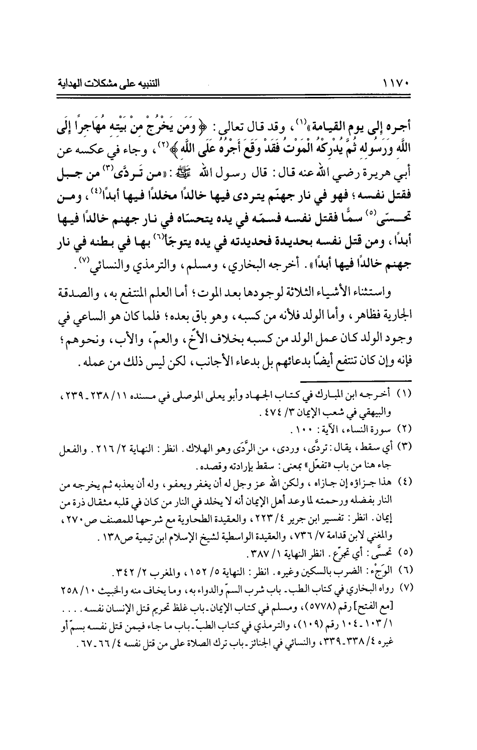 أجره إلى يوم القيامة))، وقد -قال تعالى-: {ومن يخرج من بيته مهاجرًا إلى الله ورسوله ثم يدركه الموت فقد وقع أجره على الله}، وجاء في عكسه عن أبي هريرة -رضي الله عنه- قال: قال يا رسول الله -صلى الله عليه وسلم-: ((من تردى من جبل فقتل نفسه؛ فهو في نار جهنم يتردى فيها خالدًا مخلدًا فيها أبدًا، ومن تحسى سما فقتل نفسه فسمه في يده يتحساه في نار جهنم خالدًا فيها أبدًا، ومن قتل نفسه بحديدة فحديديته في يده يتوجً بها في بطنه في نار جهنم خالدًا فيها أبدًا)). أخرجه البخاري، ومسلم، والترمذي والنسائي.