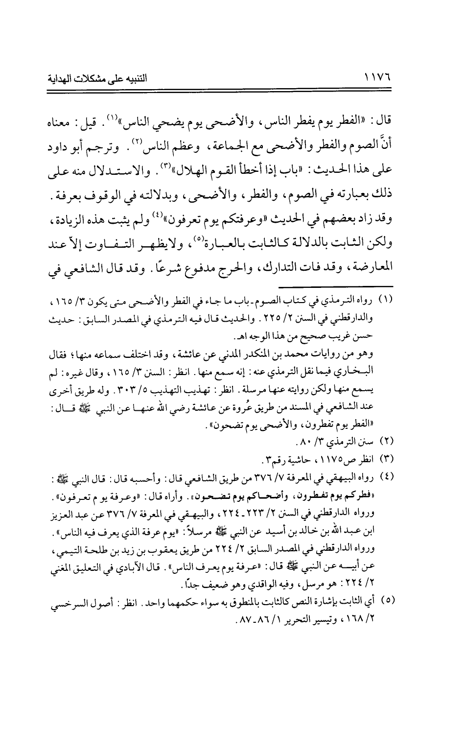 قال: ((الفطر يوم يفطر الناس، والأضحى يوم يضحي الناس)). قيل: معناه أن الصوم والفطر والأضحى مع الجماعة، وعظم الناس. وترجم أبو داود على هذا الحديث: ((باب إذا أخطأ القوم الهلال)). والاستدلال منه على ذلك بعابرته في الصوم، والفطر، والأضحى، وبدلالته في الوقوف بعرفة. وقد زاد بعضهم في الحديث ((وعرفتكم يوم تعرفون)) ولم يثبت هذه الزيادة، ولكن الثابت بالدلالة كالثابت بالعبارة، ولا يظهر التفاوت إلا عند المعارضة، وقد فات التدارك، والحرج مدفوع شرعًا. وقد قال الشافعي في