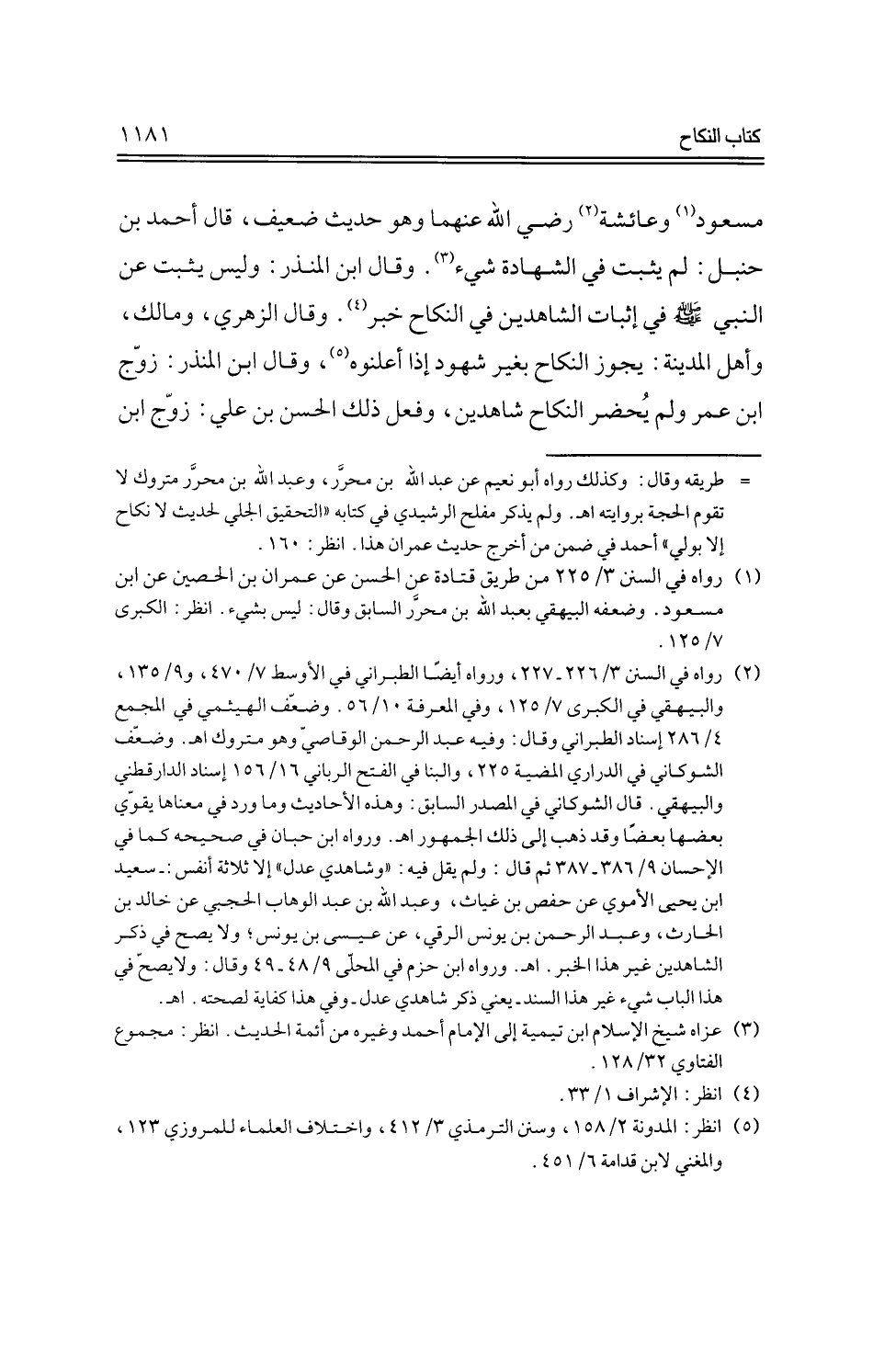 مسعود وعائشة -رضي الله عنهما- وهو حديث ضعيف، قال أحمد بن حنبل: لم يثبت في الشهادة شيء. وقال ابن المنذر: وليس يثبت عن النبي -صلى الله عليه وسلم- في إثبات الشاهدين في النكاح خبر. وقال الزهري، ومالك، وأهل المدينة: يجوز النكاح بغير شهود إذا أعلنوه، وقال ابن المنذر: زوج ابن عمر ولم يحضر النكاح شاهدين، وفعل ذلك الحسن بن علي: زوج ابن