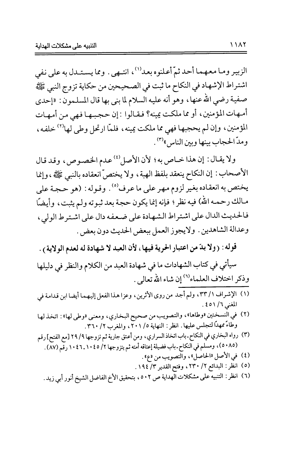الزبير وما معهما أحد ثم أعلنوه بعد، انتهى. ومما يستدل به على نفي اشتراط الإشهاد في النكاح ما ثبت في الصحيحين من حكاية تزوج النبي -صلى الله عليه وسلم- صفية -رضي الله عنها-، وهو أنه عليه السلام لما بنى بها قال المسلمون: "إحدى أمهات المؤمنين، أو مما ملكت يمينه؟ فقالوا: إن حجبها فهي من أمهات المؤمنين، وإن لم يحجبها فهي مما ملكت يمينه، فلما ارتحل وطى لها خلفه، ومد الحجاب بينها وبين الناس".