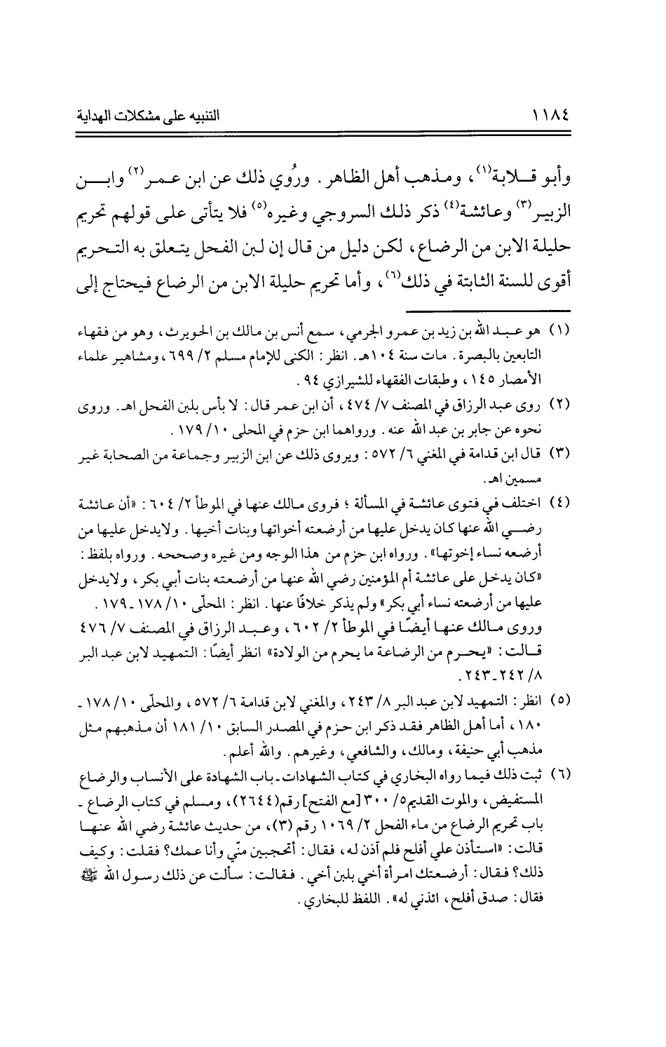 وأبو قلابة، ومذهب أهل الظاهر. وروي ذلك عن ابن عمر وابن الزبير وعائشة ذكر ذلك السروجي وغيره فلا يتأتى على قولهم تحريم حليلة الابن من الرضاع، لكن دليل من قال إن لبن الفحل يتعلق به التحريم أقوى للسنة الثابتة في ذلك، وأما تحريم حليلة الابن من الرضاع فيحتاج إلى