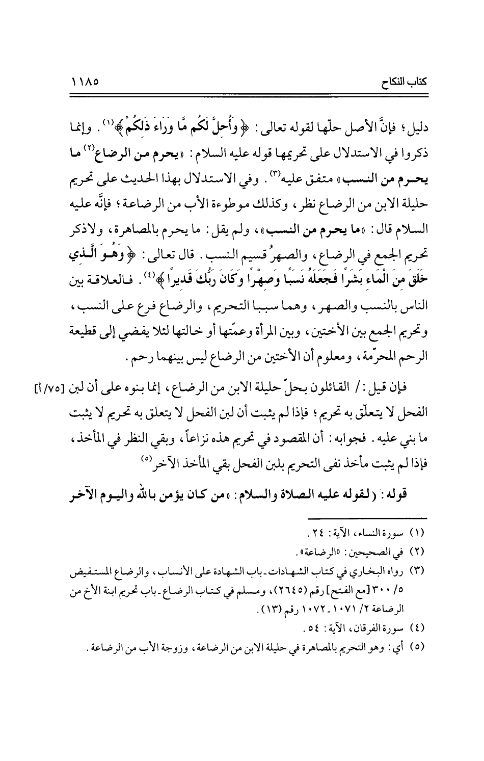فإن قيل:/ القائلون بحل حليلة الابن من الرضاع، إنما بنوه على أن لبن الفحص لا يتعلق به تحريم؛ فإذا لم يثبت أن لبن الفحل لا يتعلق به تحريم لا يثبت ما بني عليه. فجوابه: أن المقصود في تحريم هذه نزاعًا، وبقي النظر في المأخذ، فإذا لم يثبت مأخذ نفى التحريم بلبن الفحل بقي المأخذ الآخر.
