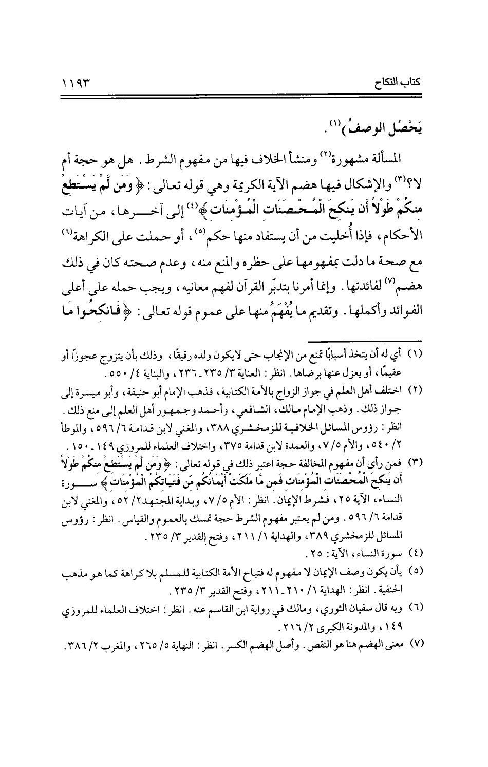 المسألة مشهورة ومنشأ الخلاف فيها من مفهوم الشرط. هل هو حجة أم لا؟ والإشكال فهيا هضم الآية الكريمة وهي قوله تعالى: {ومن لم يستطع منكم طولًا أن ينكح المحصنات المؤمنات} إلى آخرها، من آيات الأحكام، فإذا أخليت من أن يستفاد منها حكم، أو حملت على الكراهة مع صحة ما دلت بمفهومها على حظره والمنع منه، وعدم صحته كان في ذلك هضم لفائدتها. وإنما أمرنا بتدبر القرآن لفهم معانيه، ويجب حمله على أعلى الفوائد وأكملها. وتقديم ما يُفْهَمُ منها على عموم قوله تعالى: {فانكحوا ما