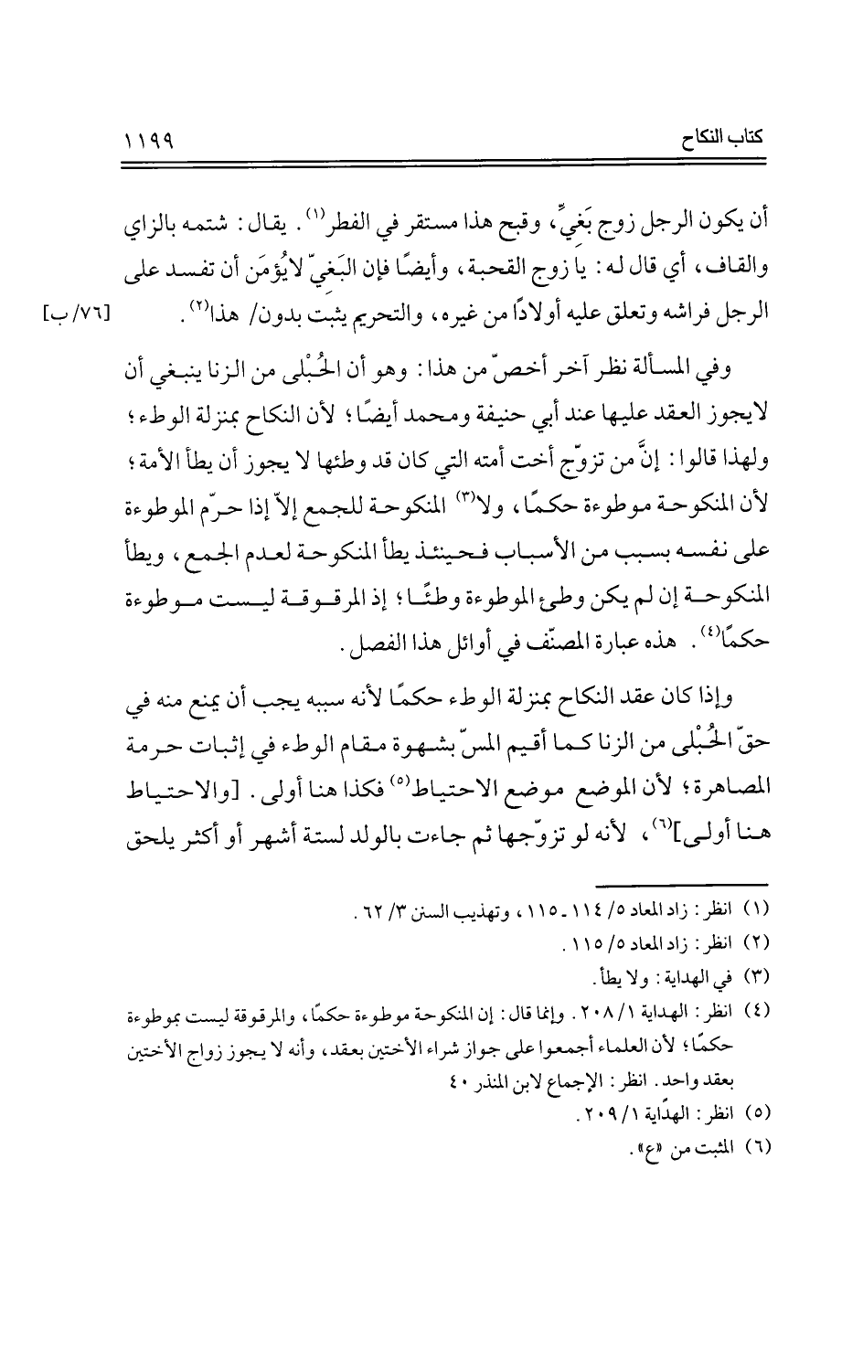 وفي المسألة نظر آخر أخص من هذا: وهو أن الحبلى من الزنا ينبغي أن لا يجوز العقد عليها عند أبي حنيفة ومحمد أيضًا، لن النكاح بمنزلة الوطء؛ ولهذا قالوا: إن من تزوج أخت أمته التي كان قد وطئها لا يجوز أن يطأ الأمة؛ لأن المنكوحة موطوءة حكمًا، ولا المنكوحة للجمع إلا إذا حرم الموطوءة على نفسه بسبب من الأسباب فحينئذ يطأ المنكوحة لعدم الجمع، ويطأ المنطوحة إن لم يكن وطئ الموطوءة وطئًا؛ إذا المرقوقة ليست موطوءة حكمًا. هذه عبارة المصنف في أوائل هذا الفصل.