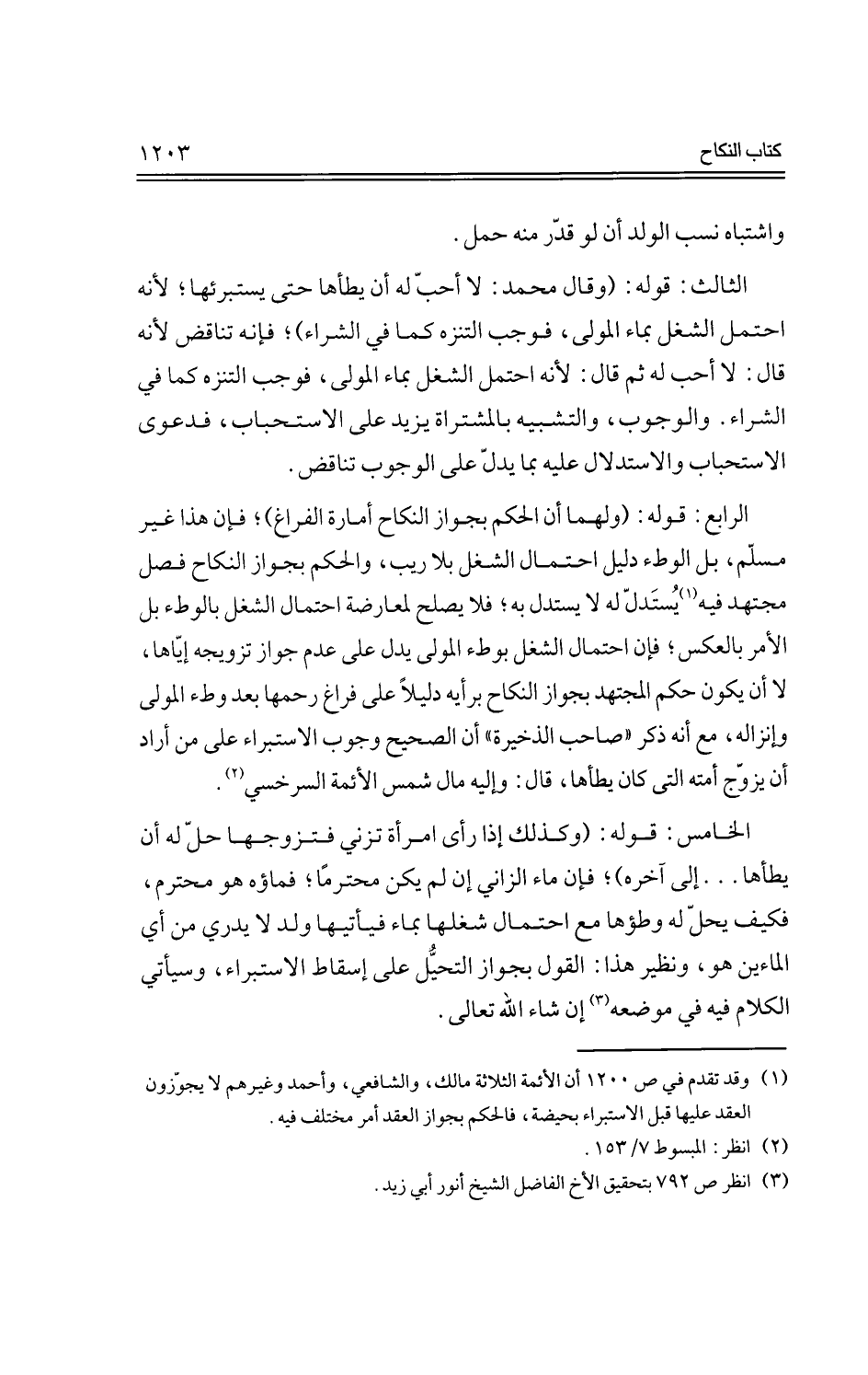 الخامس: قوله: (وكذلك إذا رأى امرأة تزني فتزوجها حل له أن يطأها ... إلى أخره)؛ فإن ماء الزاني إن لم يكن محترمًا، فماءه محترم، فكيف يحل له وطؤها مع احتمال شغلها بماء فيأتيها ولد لا يدري من أي الماءين هو، ونظير هذا: القول بجواز التحيل على إسقاط الاستبراء، وسيأتي الكلام فيه في موضعه إن شاء الله تعالى.