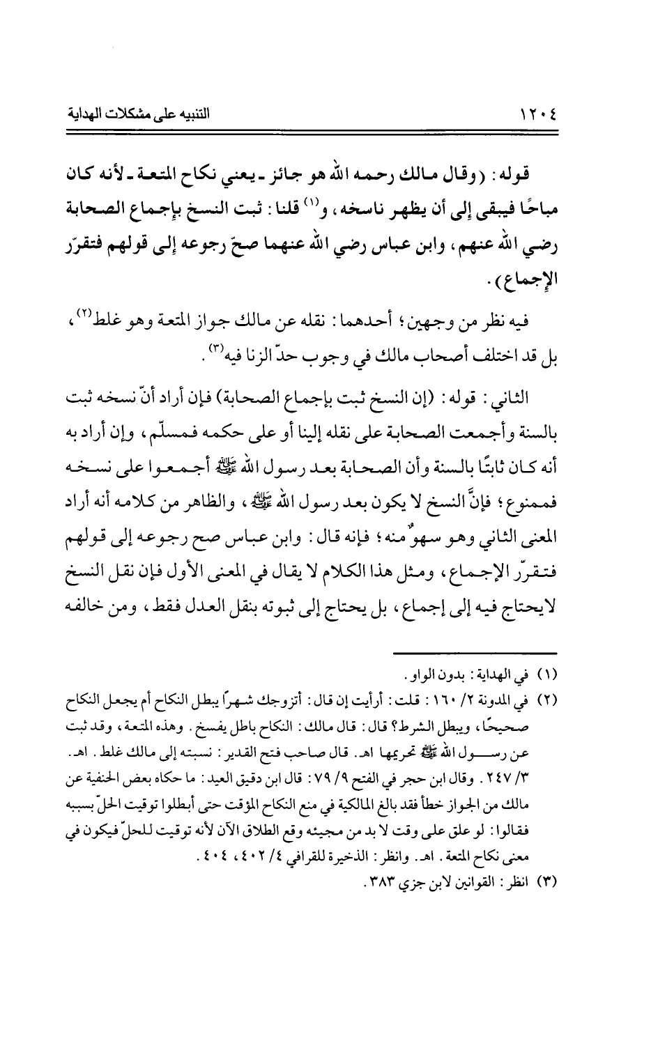 قوله: (وقال مالك رحمه الله هو جائز - يعني نكاح متعة - لأنه كان مباحًا فيبقى إلا أن يظهر ناسخه، وقلنا: ثبت النسخ بإجماع الصحابة رضي الله عنهم، وابن عباس رضي الله عنهما صح رجوعه إلى قولهم فتقرر الإجماع).
