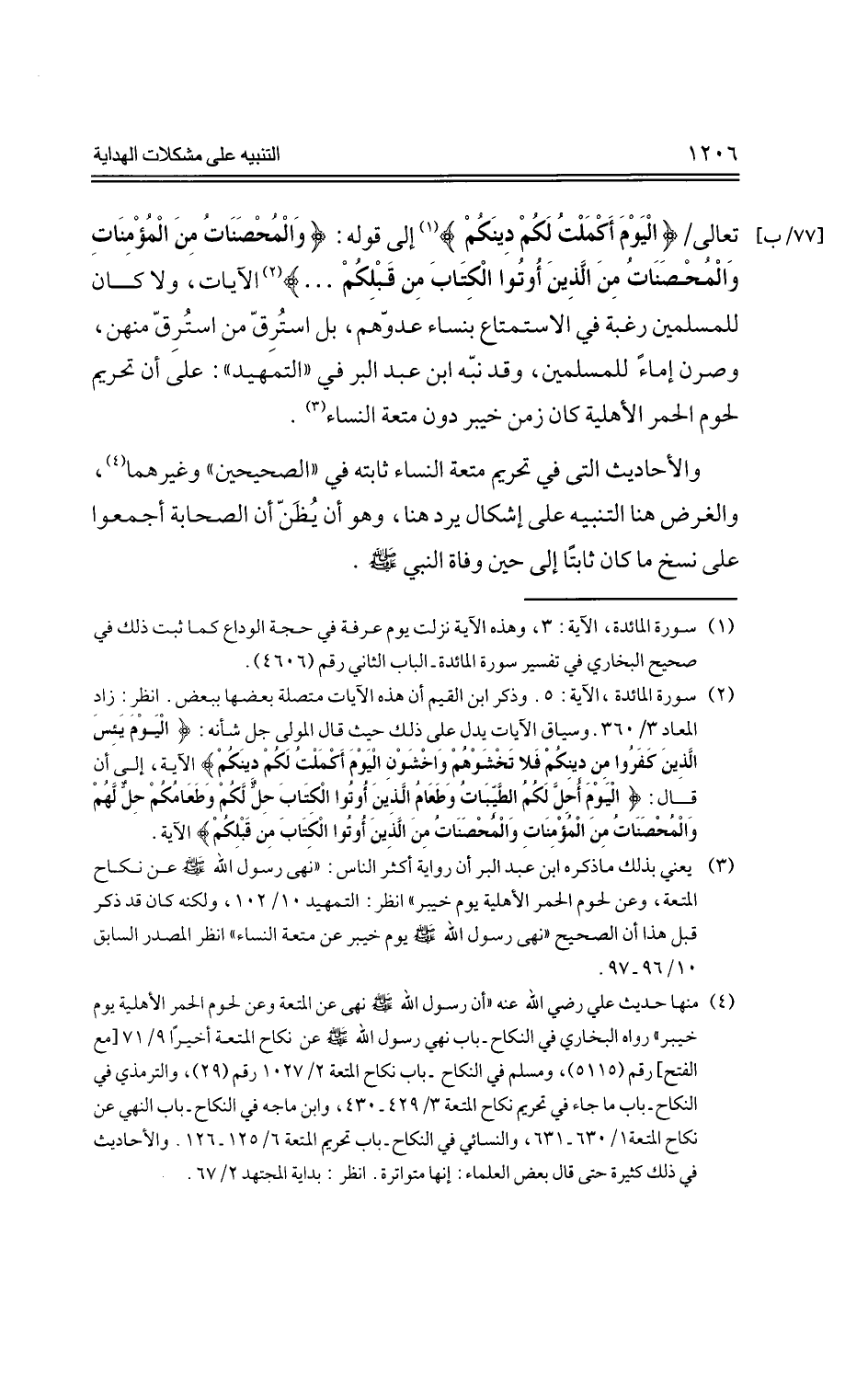 تعالى/ {اليوم أكملت لكم دينكم} إلى قوله: {والمحصنات من المؤمنات والمحصنات من الذين أوتوا الكتاب من قبلكم ..} الآيات، ولا كان للمسلمين رغبة في الاستمتاع بنساء عدوهم، بل استرق من استرق منهن، وصرن إماء للمسلمين، وقد نبه ابن عبد البر في «التمهيد» على أن تحريم لحوم الحمر الأهلية كان زمن خيبر دون متعة النساء.