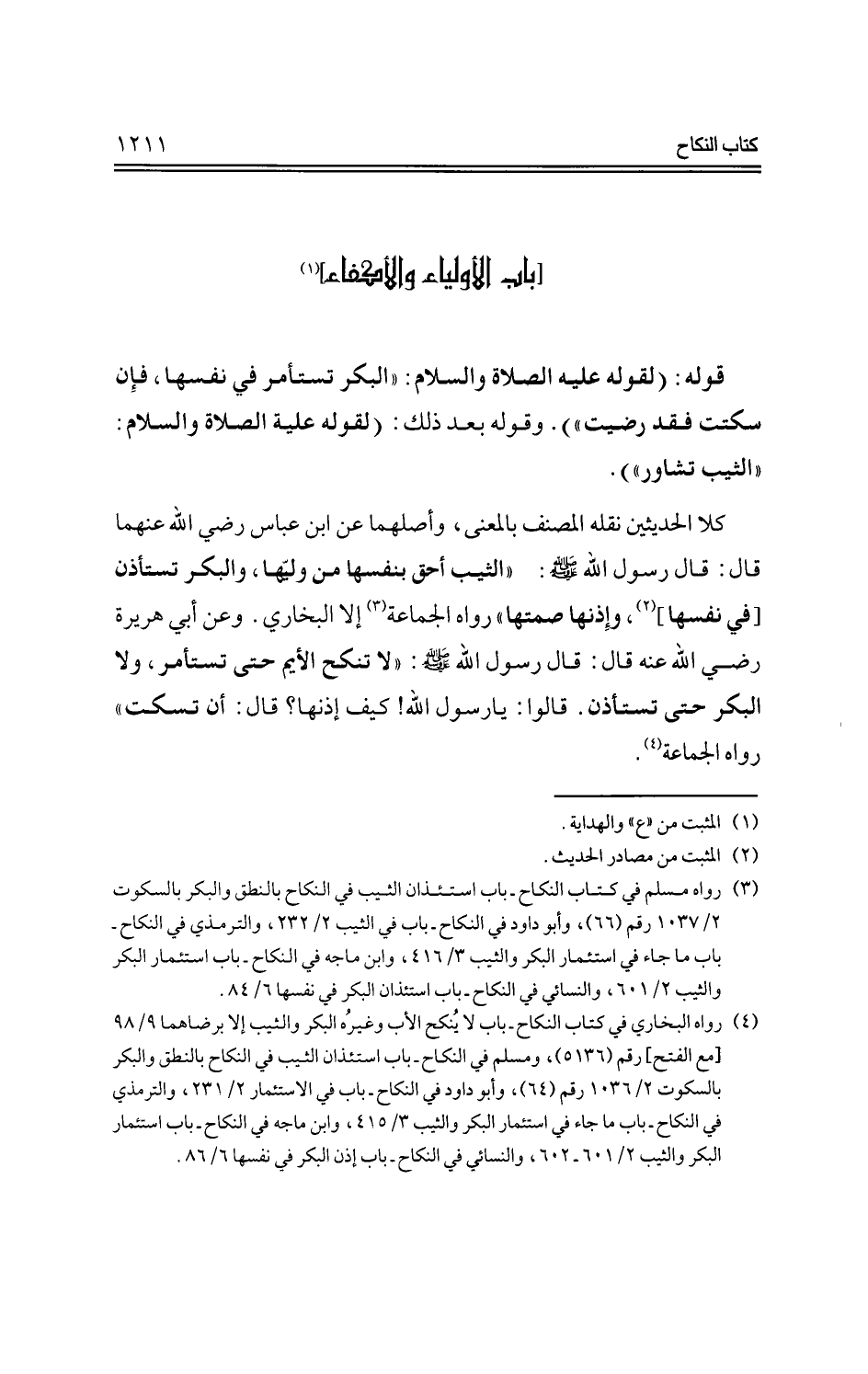 كلا الحديثين نقله المصنف بالمعنى، وأصلهما عن ابن عباس رضي الله عنهما قال: قال رسول الله صلى الله عليه وسلم: «الثيب أحق بنفسها من وليها، والبكر تستأذن (في نفسها)، وإذنها صمتها رواه الجماعة إلا البخاري. وعن أبي هريرة رضي الله عنه قال: قال رسول الله صلى الله عليه وسلم: لا تنكح الأيم حتى تستأمر، ولا البكر حتى تستأذن. قالوا: يا رسول الله! كيف إذنها؟ قال: أن تسكت» رواه الجماعة.