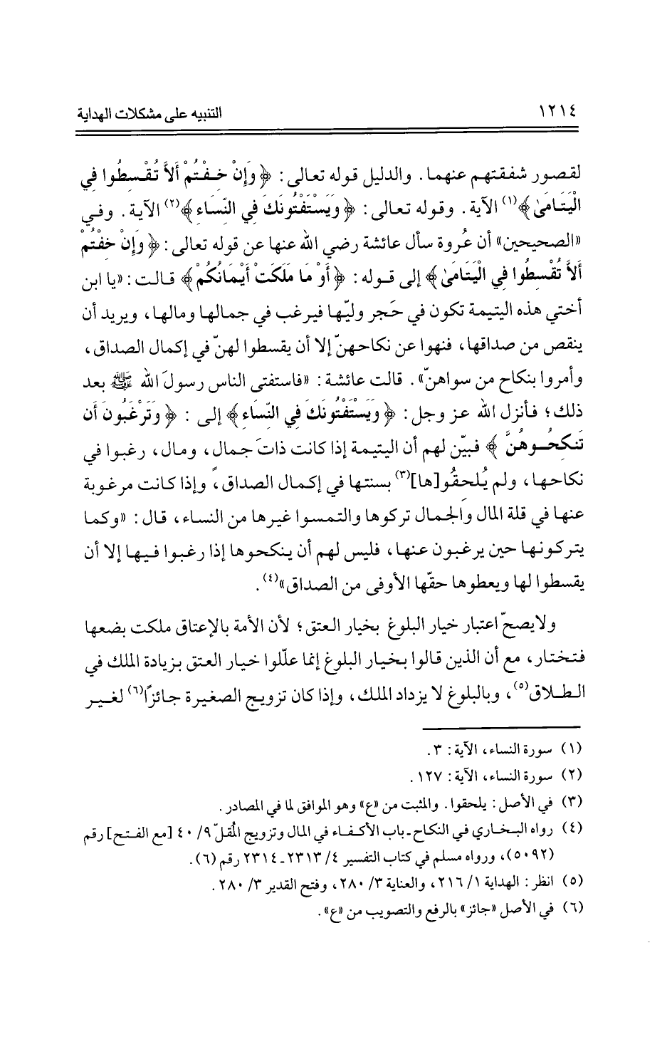 لقصور شفقتهم عنهما. والدليل قوله تعالى: {وإن خفتم ألا تقسطوا في اليتامى} الآية. وقوله تعالى: {ويستفتونك في النساء} الآية. وفي «الصحيحين» أن عُروة سأل عائشة رضي الله عنها عن قوله تعالى: {وإن خفتم ألا تقسطوا في اليتامى} إلى قوله: {أو ما ملكت أيمانكم} قالت «يا ابن أختي هذه اليتيمة تكون في حَجر وليّها فيرغب في جمالها ومالها، ويريد أن ينقص من صداقها، فنهوا عن نكاحهنّ إلا أن يقسطوا لهن في إكمال الصداق، وأمروا بنكاح عن سواهنّ». قال عائشة: فاستفتى الناس رسول الله صلى الله عليه وسلم بعد ذلك؛ فأنزل الله عز وجل: {ويستفتونك في النساء} إلى: {وترغبون أن تنكحوهن} فبيّن لهم أن اليتيمة إذا كانت ذات جمال، ومال، رغبوا في نكاحها، ولم يلحقوها، بسنتها في إكمال الصداق، وإذا كانت مرغوبة عنها في قلة المال والجمال تركوها والتمسوا غيرها من النساء، قال: «وكما يتركونها حين يرغبون عنها، فليس لهم أن ينكحوها إذا رغبوا فيها إلا أن يقسطوا لها ويعطوها حقها الأوفى من الصداق».