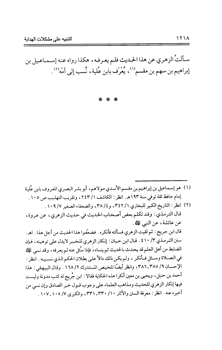 سألت الزهري عن هذا الحديث فلم يعرفه، هكذا رواه عنه إسماعيل بن إبراهيم بن سهم بن مقسم، يعرف بابن علية، نسب إلى أمة.