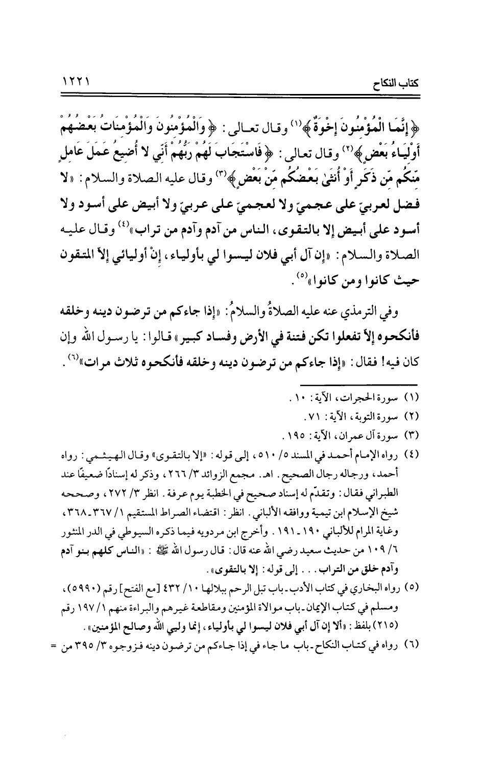 {إنما المؤمنون إخوة} وقال تعالى: {والمؤمنون والمؤمنات بعضهم أولياء بعض} وقال تعالى: {فاستجاب لهم ربهم أني لا أضيع عمل عامل منكم من ذكر أو أنثى بعضكم من بعض} وقال عليه الصلاة والسلام: "لا فضل لعربي على عجمي ولا لعجمي على عربي ولا أبيض على أسود ولا أسود على أبيض إلا بالتقوى، الناس من آدم وآدم من تراب" وقال عليه الصلاة والسلام: " إن آل أبي فلان ليسوا لي بأولياء، إن أوليائي إلا المتقون حيث كانوا ومن كانوا".