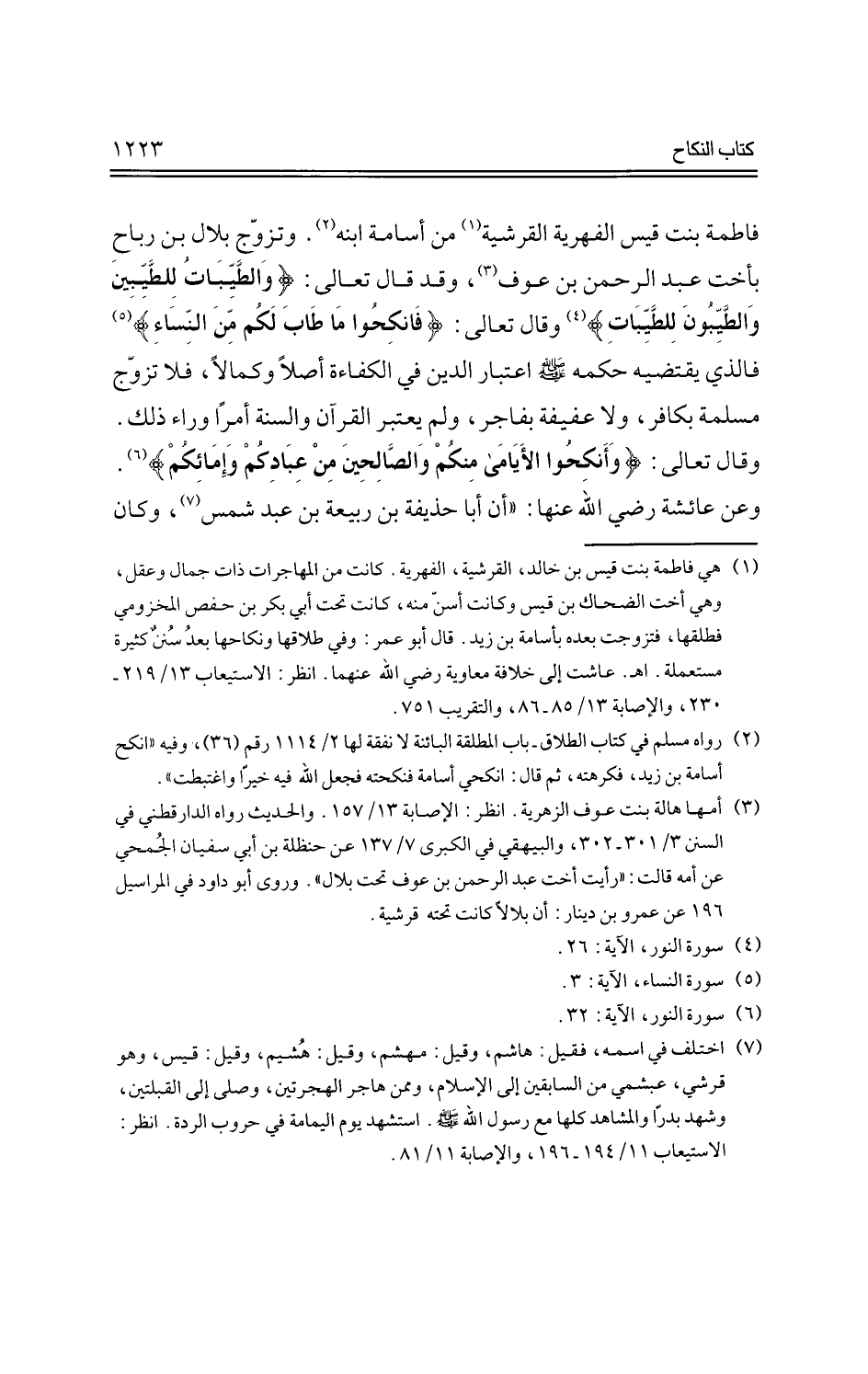 فاطمة بنت قيس الفهرية القرشية من أسامة ابنه. وتزوج بلال بن رباح بأخت عبد الرحمن بن عوف، وقد قال تعالى: {والطيبات للطيبين والطيبون للطيبات} وقال تعالى: {فانكحوا ما طاب لكم من النساء} فالذي يقتضيه حكمه صلى الله عليه وسلم اعتبار الدين في الكفاءة أصلًا وكمالًا، فلا تزوج مسلمة بكافر، ولا عفيفة بفاجر، ولم يعتبر القرآن والسنة أمرًا وراء ذلك. وقال تعالى: {وانكحوا الأيامي منكم والصالحين من عبادكم وإمائكم}.
