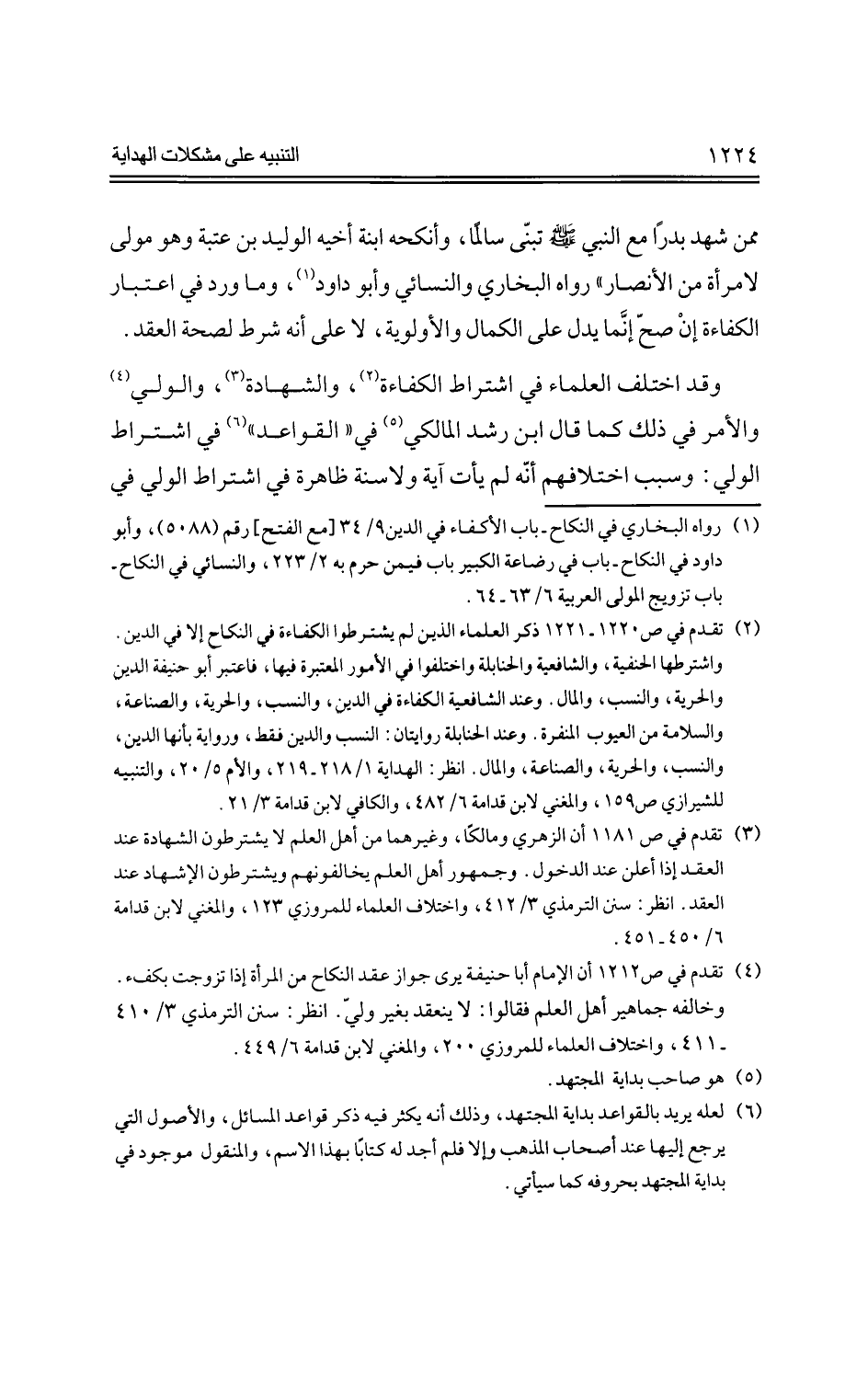 ممن شهد بدرًا مع النبي صلى الله عليه وسلم تبنى سالمًا، وانكحه ابنة أخيه الوليد بن عتبة وهو مولى لامرأة من الأنصار" رواه البخاري والنسائي وأبو داود، وما ورد في اعتبار الكفاءة إن صح إنما يدل على الكمال والأولوية، لا على أنه شرط لصحة العقد.