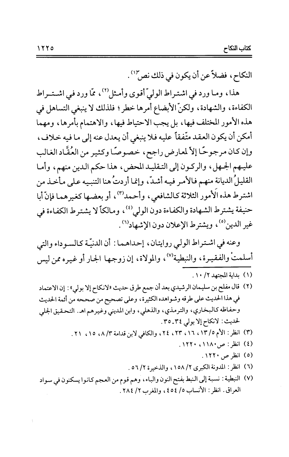 هذا وما ورد في اشتراط الولي أقوى وأمثل، مما ورد في اشتراط الكفاءة، والشهادة، ولكن الأبضاع أمرها خطر؛ فلذلك لا ينبغي التساهل في هذه الأمور المختلف فيها، بل يجب الاحتياط فيها، والاهتمام بأمرها، ومهما أمكن أن يكون العقد متفقًا عليه فلا ينبغي أن يعدل عنه إلى ما فيه خلاف، وإن كان مرجوحًا إلا لمعارض راجح، خصوصاً وكثير من العقاد الغالب عليهم الجهل، والركون إلى التقليد المحض، هذا حكم الدين منهم، وأما القليل الديانة منهم فالأمر فيه أشد، وإنما أردت هنا التنبيه على مأخ من اشترط هذه الأمور الثلاثة كالشافعي، وأحمد، أو بعضها كغيرهما فإن أبا حنيفة يشترط الشهادة والكفاءة دون الولي، ومالكًا لا يشترط الكفاءة في غير الدين، ويشترط الإعلان دون الإشهاد.