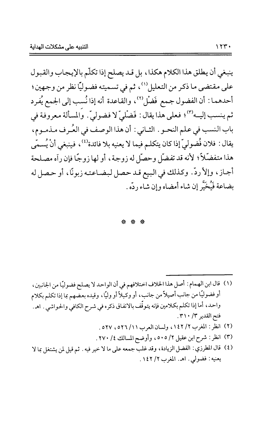 ينبغي أن يطلق هذا الكلام هكذا، بل قد يصلح إذا تكلم بالإيجاب والقبول على مقتضي ما ذكر من التعليل، ثم في تسميته فضوليًا نظر من وجهين؛ أحدهما: أن الفضول جمع فضل، والقاعدة أنه إذا نسب إلى الجمع يفرد ثم ينسب إليه؛ فعلي هذا يقال: فضلي لا فضولي، والمسألة معروفة في باب النسب في علم النحو، الثاني: أنهذا الوصف في العرف مذموم، يقال: فلان فضولي إذا كان يتكلم فيما لا يعنيه بلا فائدة، فينبغي أن يسمي هذا متفضلاً؛ لأنه قد تفضل وحصل له زوجة، أو لها زوجًا فإن رآه مصلحة أجاز، وإلا رد وكذلك في البيع قد حصل لبضاعته زنونًا، أو حصل له بضاعة فيخير إن شاء أمضاه وإن شاء رده.