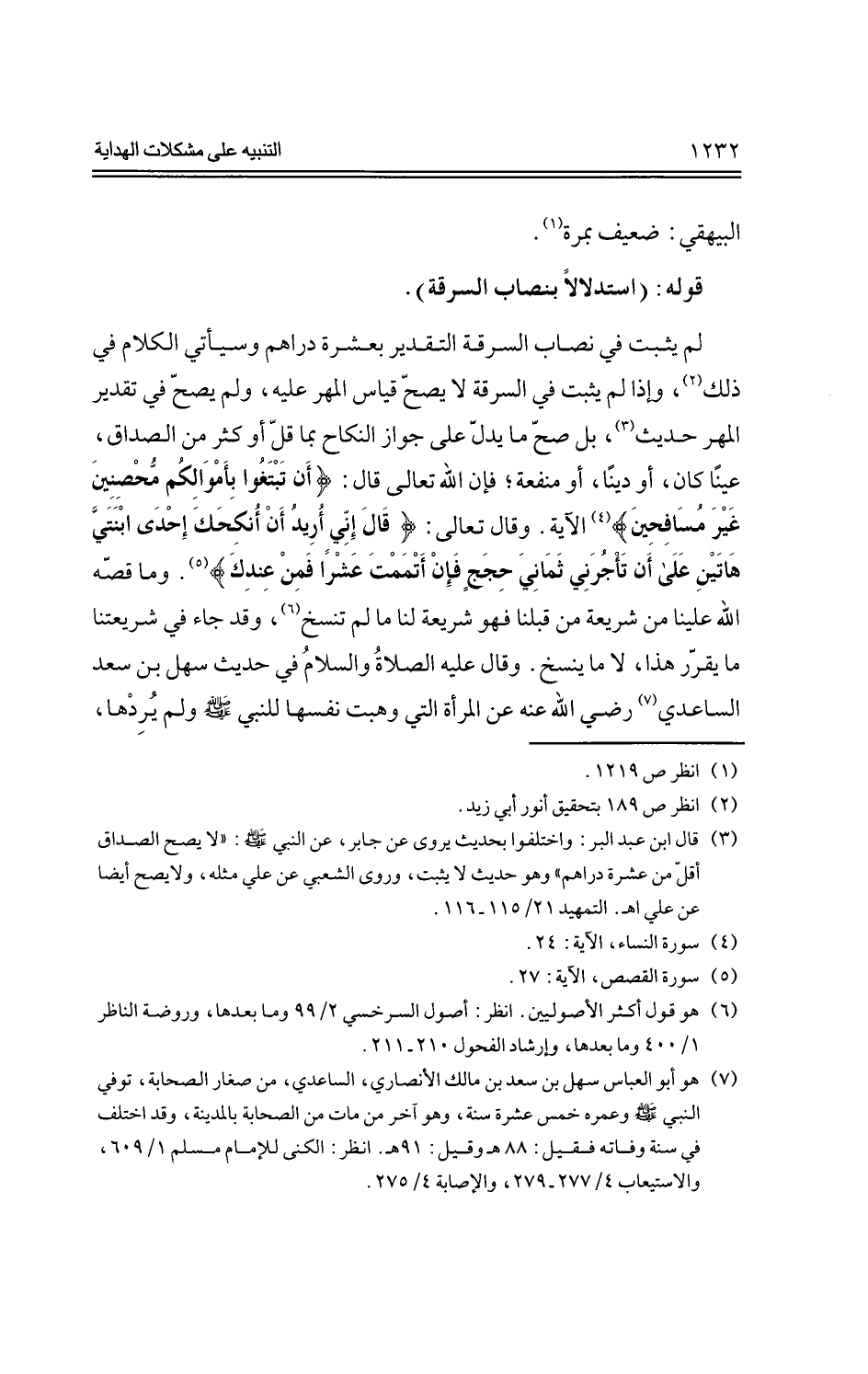 لم يثبت في نصاب السرقة التقدير بعشرة دراهم وسيأتي الكلام في ذلك، وإذا لم يثبت في السرقة لا يصح قياس المهر عليه، ولم يصح في تقدير المهر حديث، بل صح ما يدل على جواز النكاح بما قل أو كثر من الصداق، عينًا كان، أودينًا، أو منفعة؛ فإن الله تعالي قال: {أن تبتغوا بأموالكم محصنين غي رمسافحين} الآية، وقال تعالي: {قال إني أريد أن أنكحك إحدى ابنتي هاتين على أن تأجرني ثماني حجج فإن أتممت عشرًا فمن عندك} وما قصه الله علينا من شريعة من قبلنا فهو شريعة لنا ما لم تنسخ، وقد جاء في شريعتنا ما يقرر هذا، لا ما ينسخ، وقال عليه الصلاة والسلام في حديث سهل بن سعد الساعدي، رضي الله عنه عن المرأة التي وهبت نفسها للنبي -صلي الله عليه وسلم- ولم يردها،