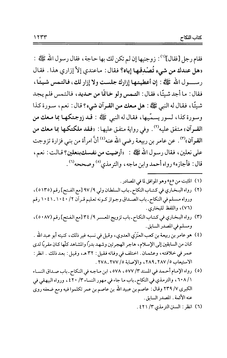فقام رجل [فقال]: زوجنيها إن لم تكن لك بها حاجة، فقال رسول الله -صلي الله عليه وسلم: "هل عندك من شيء تصدقها إياه؟ فقال: ما عندي إلا إزاري هذا، فقال رسول الله -صلي الله عليه وسلم-: إن أعطيتها إزارك جلست ولا إزار لك، فالتمس شيئًا، فقال: ما أجد شيئًا، فقال: التمس ولو خاتمًا من حديد، فالتمس فلم يجد شيئًا، فقال له النبي - صلي الله عليه وسلم-: هل معك من القرآن شيء؟ قال: نعم، سورة كذا وسورة كذا، لسور يسميها، فقال له النبي -صلي الله عليه وسلم-: قد زوجتكما بما معك من القرآن" متفق عليه، وفي رواية متفق عليها: "فقد ملكتكها بما معك من القرآن" عن عامر بن ربيعة رضي الله عنه أن امرأة من بني فزارة تزوجت على نعلين، فقال رسول الله -صلي الله عليه وسلم-:أرضيت من نفسك بنعلين؟ قالت: نعم، قال: فأجازه" رواه أحمد وابن ماجه، والترمذي وصححه.