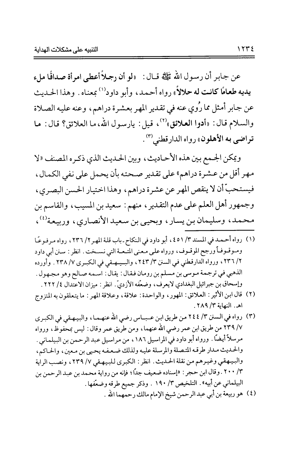 عن جابر أن رسول الله -صلي الله عليه وسلم-قال: "لو أن رجلاً أعظي امرأة صادقًا ملء يديه طعامًا كانت له حلالاً" رواه أحمد، وأبو داود بمعناه، وهذا الحديث عن جابر أمثل مما روي عنه في تقدير المهر بعشرة دراهم، وعنه عليه الصلاة والسلام قال: "أدوا العلائق"، قيل: يا رسول الله، ما العلائق؟ قال: ما تراض به الأهلون" رواه الدارقطني.