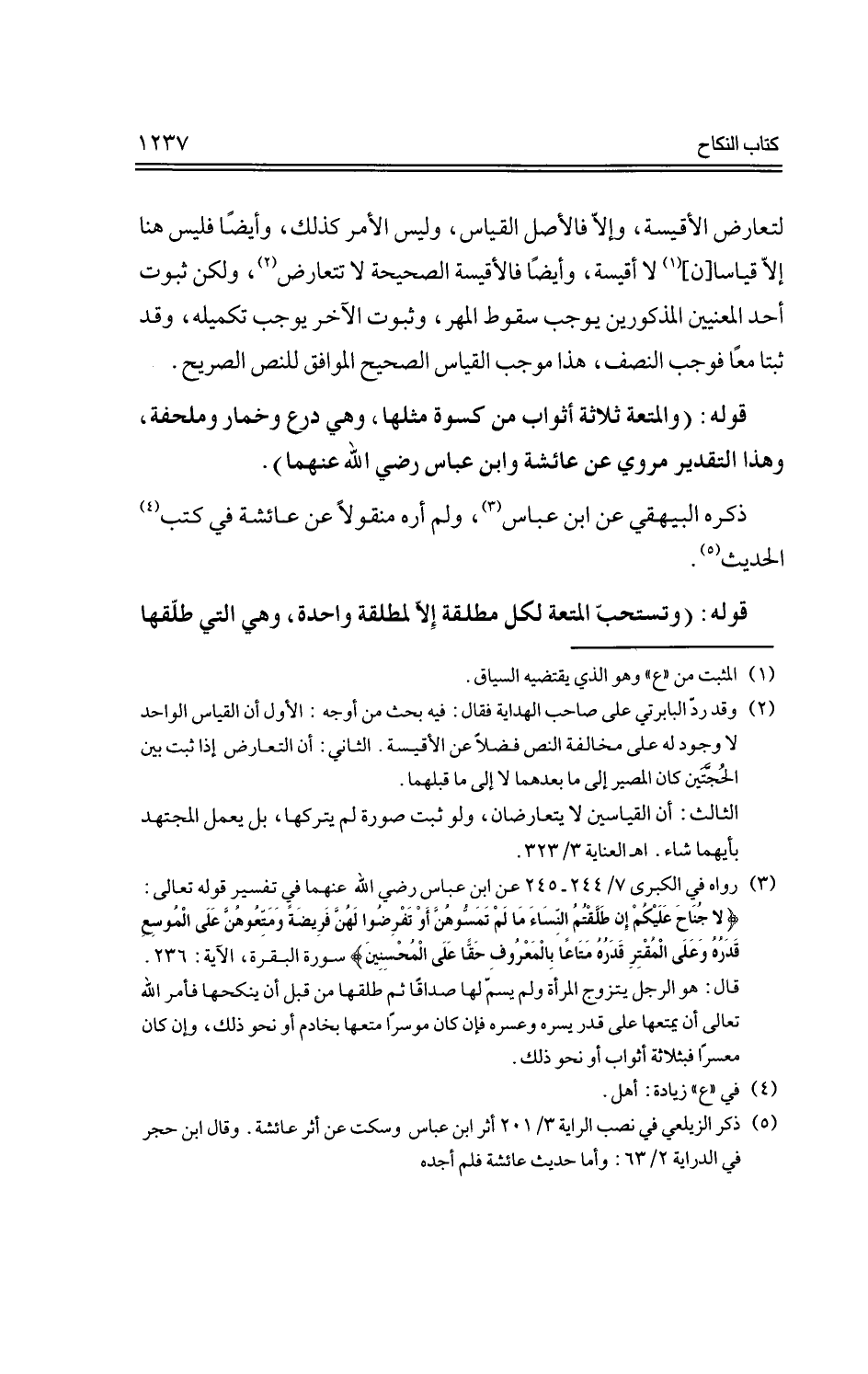 قوله: (والمتعة ثلاثة أبواب من كسوة مثلها، وهي درع وخمار وملحقة، وهذا التقدير مروري عن عائشة وأبن عباس رضي الله عنهما).