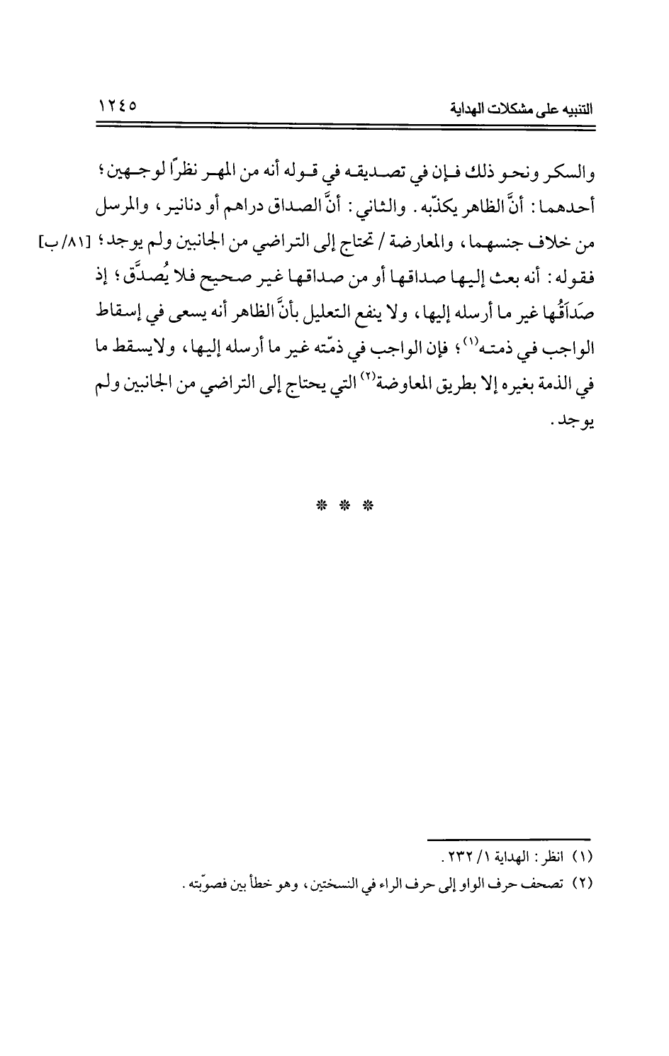 والسكر ونحو ذلك فإن في تصديقه في قوله أنه من المهر نظرًا لوجهين؛ أحدهما: أن الظاهر يكذبه، والثاني: أن الصداق دراهم أو دنانير، والمرسل من خلاف جنسهما، والمعارضة/ تحتاج إلى التراض من الجانبين ولم يوجد؛ فقوله: أنه بعث إليها صداقها أو من صداقها غير صحيح فلا يصدق إذا صداقها غير ما أرسله إليها، ولا ينفع التعليل بأن الظاهر أنه يسعي في إسقاط الواجب في ذمته؛ فإن الواجب في ذمته غير ما أرسله إليها، ولا يسقط ما في الذمة بغيره إلا بطريق المعاوضة التي يحتاج إلى التراض من الجانبين ولم يوجد.