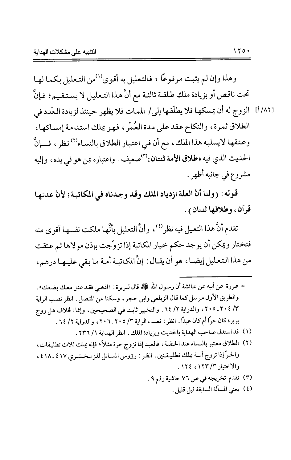 وهذا وإن لم يثبت مرفوعًا، فالتعليل به أقوي من التعليل بكمالها تحت ناقص أو بزيادة ملك طلقه ثالثة مع أن هذا التعليل لا يستقيم؛ فإن الزوج له أن يمسكها فلا يطلقها إلى / الممات فلا يظهر حينئذ لزيادة العدد في الطلاق ثمرة، والنكاح عقد على مدة العمر، فهو يملك استدامة إمساكها، وعتقها لا يسلبه هذا الملك، مع أن في اعتبار الطلاق بالنساء نظر، فإن الحديث الذي فيه "طلاق الأمة ثنتان" ضعيف واعتباره بمن هو في يده، وإليه مشروع في جانبه أظهر.