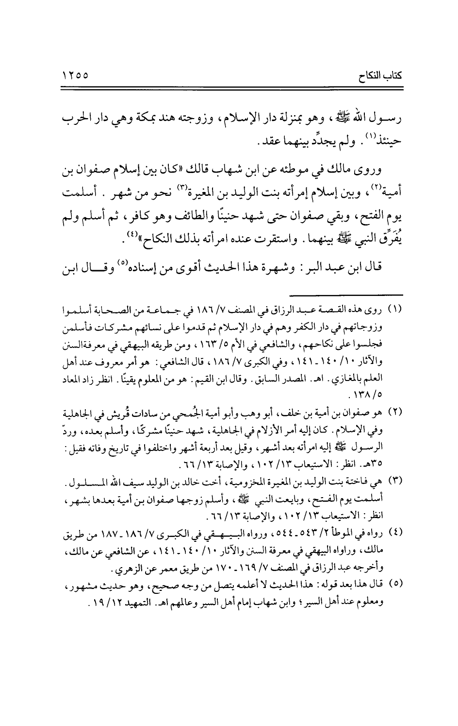 وروي مالك في موطئه عن ابن شهاب قال "كان بين إسلام صفوان بن أمية، وبين إسلام امرأته بنت الوليد بن المغيرة نحو من شهر أسلمت يوم الفتح، وبقي صفوان حتى شهد حنينًا والطائف وهو كافر، ثم أسلم ولم يفرق النبي -صلي الله عليه وسلم- بينهما، واستقرت عنده امرأته بذلك النكاح".