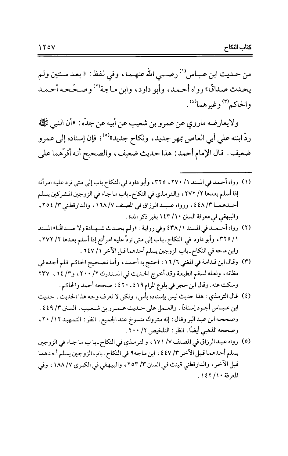 ولا يعارضه ما روي عن عمرو بن شعيب عن أبيه عن جده: "أن النبي -صلي الله عليه وسلم- رد ابتنه علي أبي العاص بمهر جديد، ونكاح جديد"؛ فإن إسناده إلى عمرو ضعيف، قال الإمام أحمد: هذا حديث ضعيف، والصحيح أنه أقرهما على