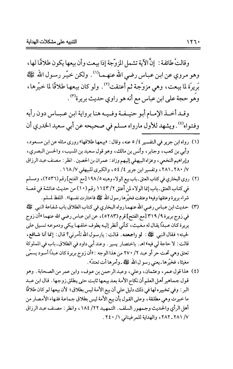 وقالت طائفة: إن الآية تشمل المزوجة إذا بيعت وأن بيعها يكون طلاقًا لها، وهو مروي عن ابن عباس رضي الله عنهما، ولكن خير رسول الله-صلي الله عليه وسلم- بريرة لم بيعت، وهي مزوجة ثم أعتقت، ولو كان بيعها طلاقًا لما خيرها، وهو حجة علي ابن عباس مع أنه هو راوي حديث بريرة.