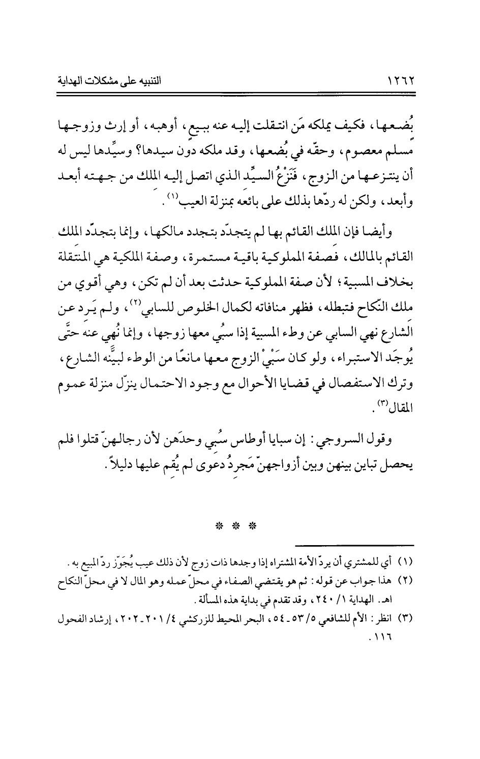 وأيضًا فإن الملك القائم بها لم يتجدد بتجدد مالكها، وإنما بتجدد الملك القائم بالمالك، فصفة المملوكية باقية مستمرة، وصفة الملكية هي المنتقلة بخلاف المسبية؛ لأن صفة المملوكية حدثت بعد أن لم تكن، وهي أقوي من ملك النكاح فتبطله، فظهر منافاته لكمال الخلوص للسابي، ولم يرد عن الشارع نهي السابي عن وطء المسبية إذا سبي معها زوجها، وإنما نهي عنه حتى يوجد الاستبراء، ولو كان سبي الزوج معها مانعًا من الوطء لبينه الشارع، وترك الاستفصال في قضايا الأحوال مع وجود الاحتمال ينزل منزلة عموم المقال.