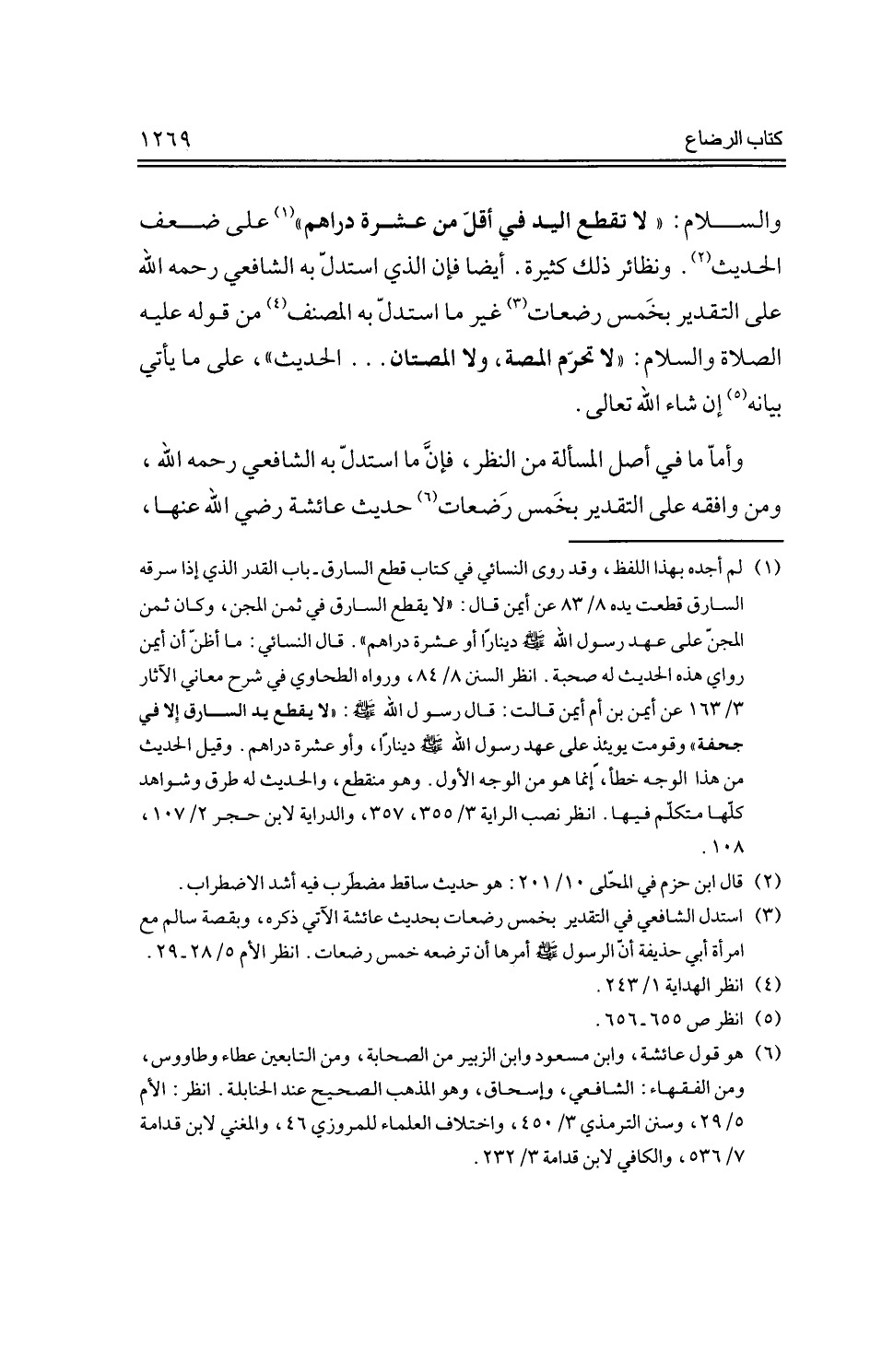 والسلام: "لا تقطع اليد في أقل من عشرة دراهم" على ضعف الحديث، ونظائر ذلك كثيرة، أيضًا فإن الذي استدل به الشافعي رحمه الله على التقدير بخمس رضعات غير ما استدل به المصنف من قوله عليه الصلاة والسلام: "لا تحرم المصة، ولا المصتان ... الحديث"، على ما يأتي بيانه إن شاء الله تعالي.