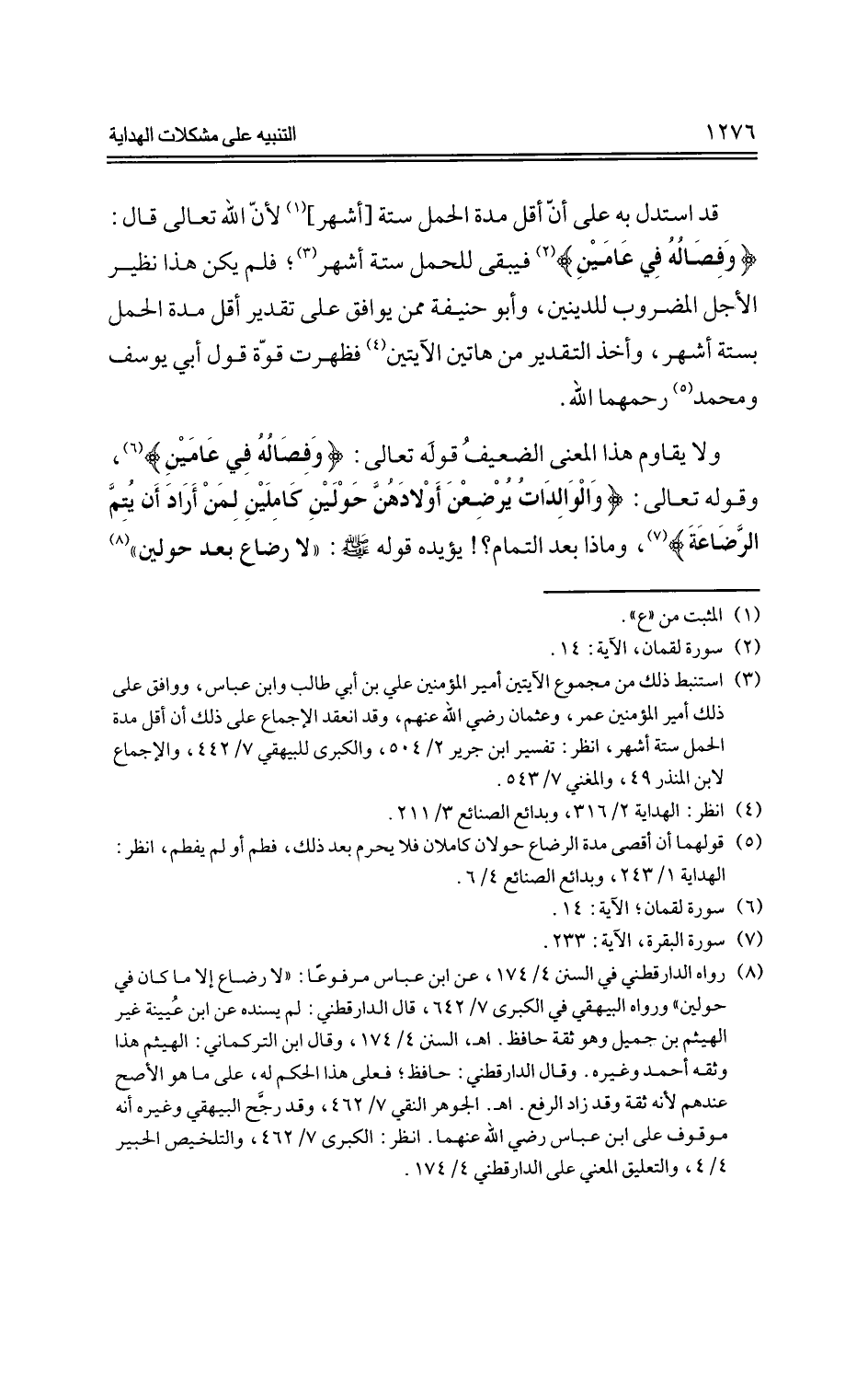 قد استدل به على أن أقل مدة الحمل ستة [أشهر] لأن الله تعالي قال: {وفصاله في عامين} فيبقي للحمل ستة أشهر؛ فلم يكن هذا نظير الأجل المضروب للدينين، وأبو حنيفة ممن يوافق على تقدير أقل مدة الحمل بستة أشهر، وأخذ التقدير من هاتين الآيتين فظهرت قوة قول أبي يوسف ومحمد رحمهما الله.