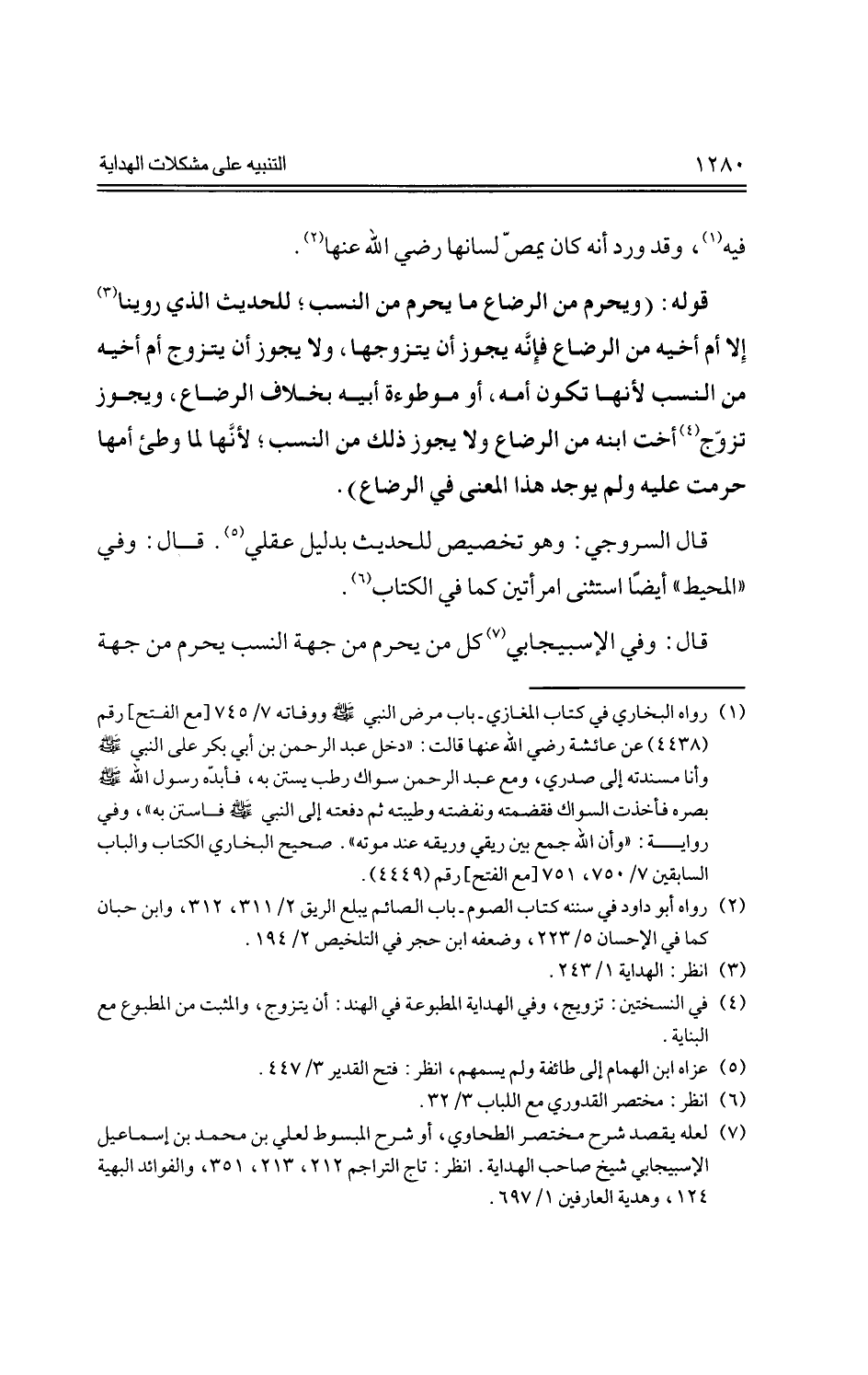 قوله: (ويحرم من الرضاع ما يحرم من النسب؛ للحديث الذي روينا إلا أم أخيه من الرضاع ولا يجوز ذلك أن يتزوجها، ولا يجوز أن يتزوج أم أخيه من النسب لأنها تكون أمه، أو موطوءة أبيه بخلاف الراضع، ويجوز تزوج أخت ابنه من الرضاع، ولا يجوز ذلك من النسب؛ لأنها لما وطيء أمها حرمت عليه ولم يوجد هذا المعني في الرضاع).