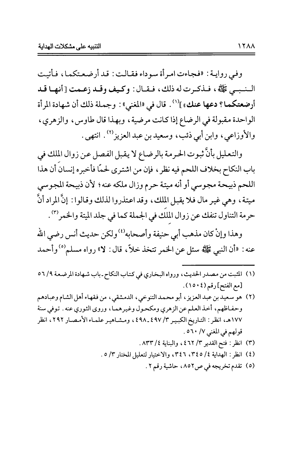 والتعليل بأن ثبوت الحرمة بالرضاع لا يقبل الفصل عن زوال الملك في باب النكاح بخلاف اللحم فيه نظر، فإن من اشتري لحمًا فأخبره إنسان أن هذا اللحم ذبيحة مجوسي أو أنه ميتة حرم وزال ملكه عنه؛ لأن ذبيحة المجوسي ميتة، وهي غير مال فلا يقبل الملك، وقد اعتذروا لذلك وقالوا: إن المراد أن حرمة التناول تنفك عن زوال الملك في الجملة كما في جلد الميتة والخمر.