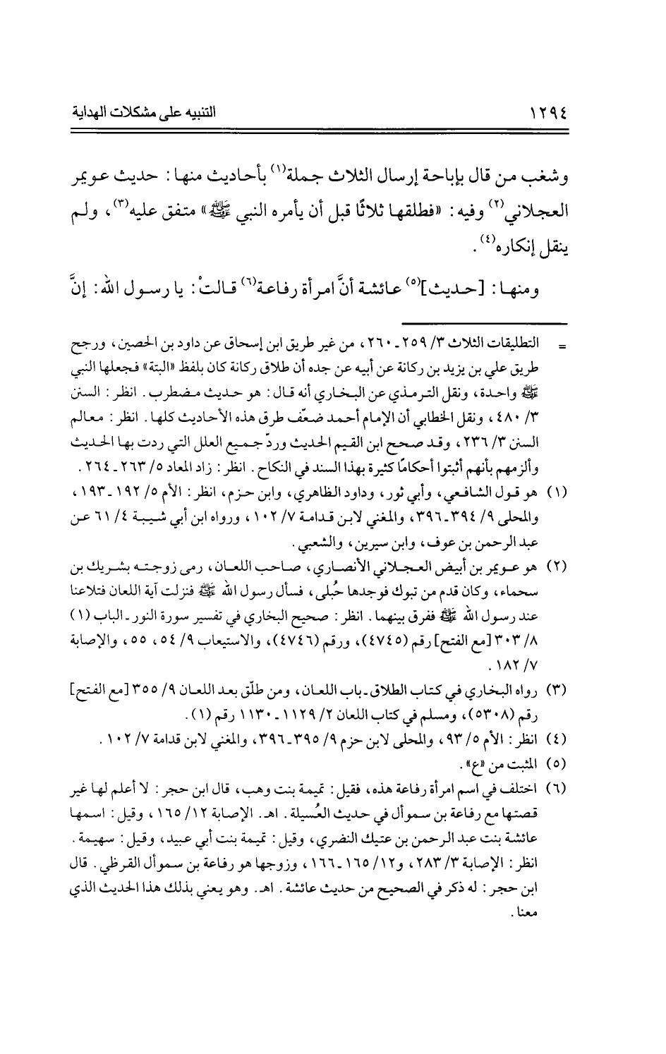 ومنها: [حديث] عائشة أن امرأة رفاعة قالت: يا رسول الله: إن