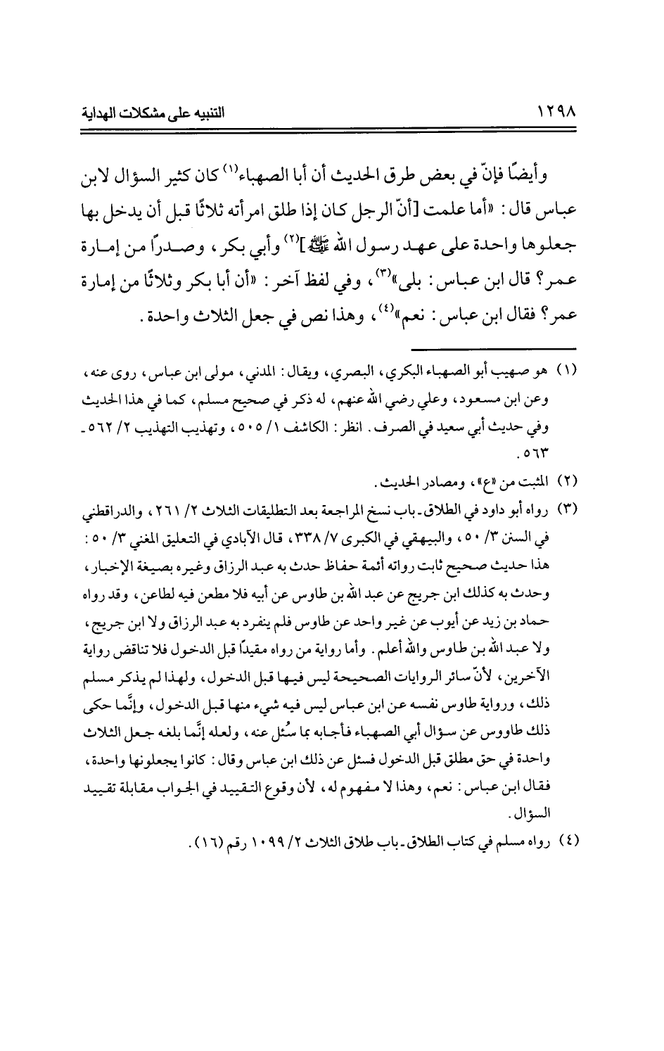 وأيضًا فإن في بعض طرق الحديث أن أبا الصهباء كان كثير السؤال لابن عباس قال: "أما علمت [أنا الرجل كان إذا طلق امرأته ثلاثًا قبل أن يدخل بها جعلوها واحدة علي عهد رسول الله -صلي الله عليه وسلم- وأبي بكر، وصدرًا من إمارة عمر؟ قال ابن عباس: بلي"، وفي لفظ آخر: "أن أبا بكر وثلاثًا من إمارة عمر؟ فقال ابن عباس: نعم"، وهذا نص في جعل الثلاث واحدة.