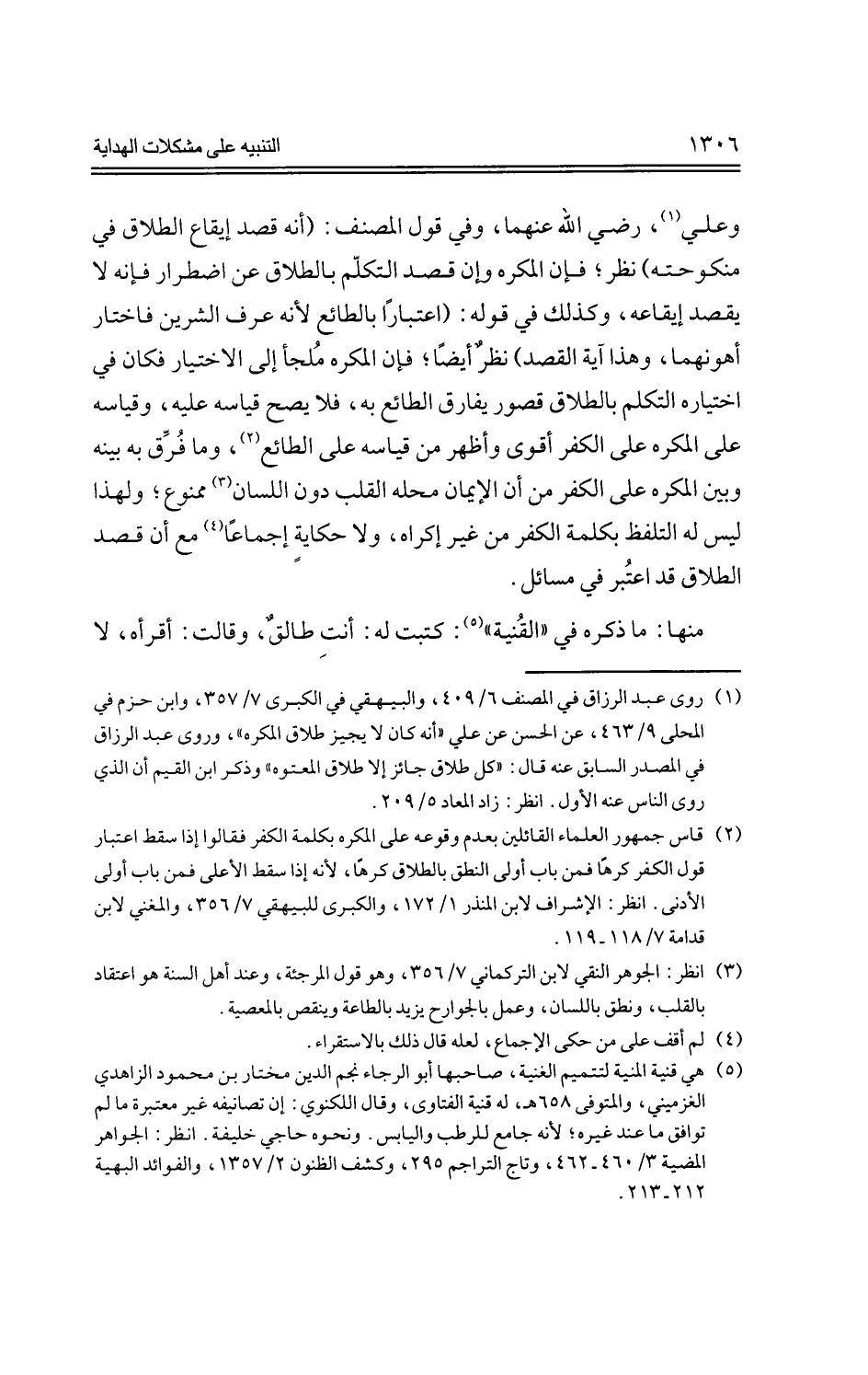 وعلي، رضي الله عنهما، وفي قول المصنف: (أنه قصد إيقاع الطلاق في منكوحته) نظر؛ فإن المكره وإن قصد التكلم بالطلاق عن اضطرار فإنه لا يقصد إيقاعه، وكذلك في قوله: اعتبارًا بالطائع لأنه عرف الشرين فاختار أهونهما، وهذا آية القصد) نظر أيضًا؛ فإن المكره ملجأ إلى الاختيار فكان في اختياره التكلم بالطلاق قصور يفارق الطائع به، فلا يصح قياسه عليه، وقياسه على المكره على الكفر على الكفر أقوي وأظهر من قياسه على الطائع، وما فرق به بينه وبين المكره على الكفر من أن الإيمان محله القلب دون اللسان ممنوع؛ ولهذا ليس له التلفظ بكلمة الكفر من غير إكراه، ولا حكاية إجماعًا مع أن قصد الطلاق قد اعتبر في مسائل.