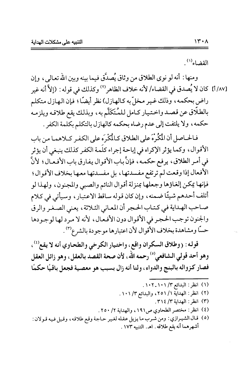 فالحاصل أن المكره على الطلاق كالمكره على الكفر كلاهما من باب الأقوال، وكما يؤثر الإكراه في إباحة إجراء كلمة الكفر كذلك ينبغي أن يؤثر في أمر الطلاق، يرفع حكمه، فإن باب الأقوال يفارق باب الأفعال؛ لأن الأفعال إذا وقعت لم ترتفع مفسدتها، بل مفسدتها معها بخلاف الأقوال؛ فإنها يمكن إلغاؤها وجعلها بمنزلة أقوال النائم والصبي والمجنون، ولهذا لو أتلف أحدهم شيئًا ضمنه، وإن كان قوله ساقط الاعتبار، وسيأتي في كلام صاحب الهداية في كتاب الحجر أن المعاني الثلاثة، يعني الصغر والرق والجنون توجب الحجر في الأقوال دون الأفعال، لأنه لا مرد لها لوجودها حسًا ومشاهدة بخلاف الأقوال لأن اعتبارها موجودة بالشرع.