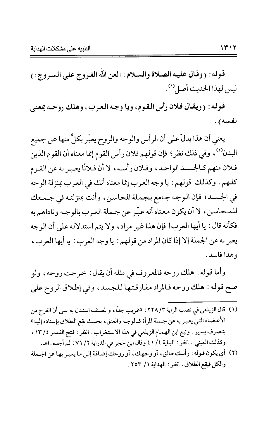 يعني أن هذا يدل على أن الرأس والوجه والروح يعبر بكل منها عن جميع البدن، وفي ذلك نظر؛ فإن قولهم فلان رأس القوم إنا معناه أن القوم الذين فلان منهم كالجسد الواحد، وفلان رأسه، لا أن فلانًا يعبر به عن القوم كلهم، وكذلك قوهم: يا وجه العرب إنما معناه أنك في العرب بمنزله الوجه في الجسد؛ فإن الوجه جامع بجملة المحاسن، وأنت بمنزلته ي جمعك للمحاسن، لا أن يكون معناه أنه عبر عن جملة العرب بالوجه وناداهم به فكأنه قال: يا أيها العرب! فإن هذا غير مراد، ولا يتم استدلال على أن الوجه يعبر به عن الجملة إلا إذا كان المراد من قولهم: يا وجه العرب: يا أيها العرب، وهذا فاسد.