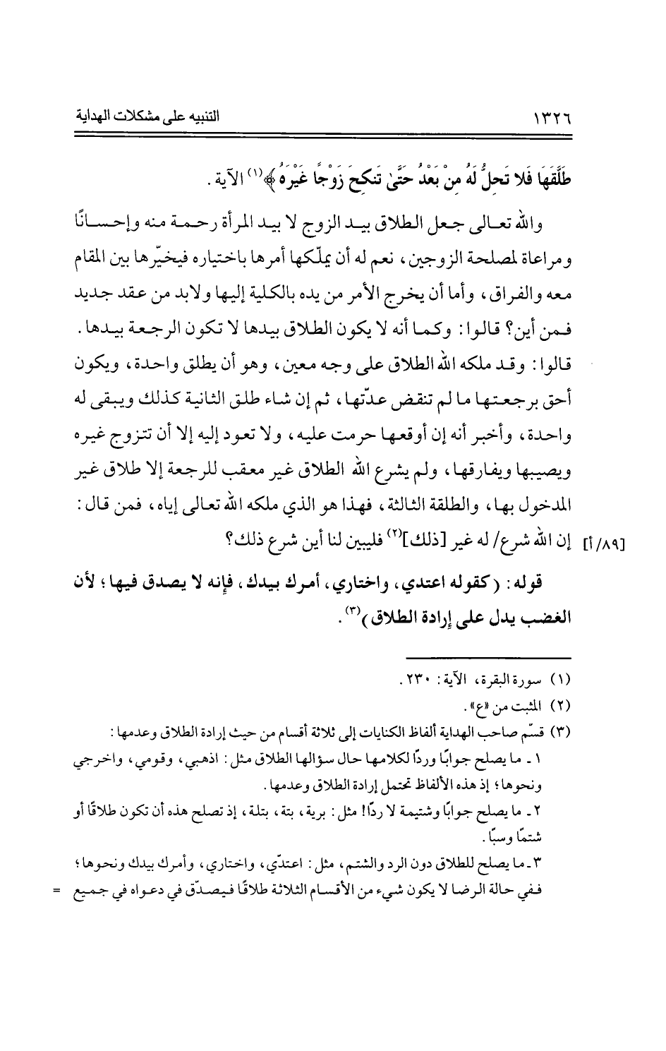 والله تعالي جعل الطلاق بيد الزوج لا بيد المرأة رحمة منه وإحسانًا ومراعاة لمصلحة الزوجين، نعم له أن يملكها أمرها باختياره فيخيرها بين المقام معه والفراق، وأما أن يخرج الأمر من يده بالكلية إليها ولا بد من عقد جديد فمن أين؟ قالوا: وكما أنه لا يكون إطلاق بيدها لا تكون الرجعة بيدها، قالوا: وقد ملكه الطلاق على وجه معين، وهو أن يطلق واحدة، ويكون أحق برجعتها ما لم تنقض عدتها، ثم إن شاء طلق الثانية كذلك ويبقي له واحدة، وأخبر أنه إن أوقعها حرمت عليه، ولا تعود إليه إلا أن تتزوج غيره ويصيبها ويفارقها، ولم يشرع الله الطلاق غير معقب للرجعة إلا طلاق غير المدخول بها، والطلقة الثالثة، فهذا هو الذي ملكه الله تعالي إياه، فمن قال: إن الله شرع/ له غير [ذلك] فليبين لنا أين شرع ذلك؟