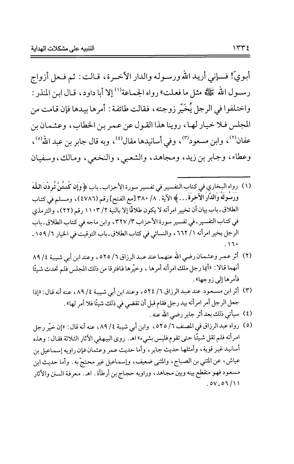 أبوي! فإني أريد الله ورسوله والدار الآخرة، قالت: ثم فعل أزواج رسول الله -صلي الله عليه وسلم- مثل ما فعلت" رواه الجماعة إلا أبا داود، قال ابن المنذر: واختلفوا في الرجل يخير زوجته، فقالت طائفة: أمرها بيدها فإن قامت من المجلس فلا خيار لها، روينا هذا القول عن عمر بن الخطاب، وعثمان بن عفان، وابن مسعود، وفي أسانيدها مقال، وبه قال جابر بن عبد الله، وعطاء، وجابر بن زيد، ومجاهد، والشعبي، والنخعي، ومالك، وسفيان