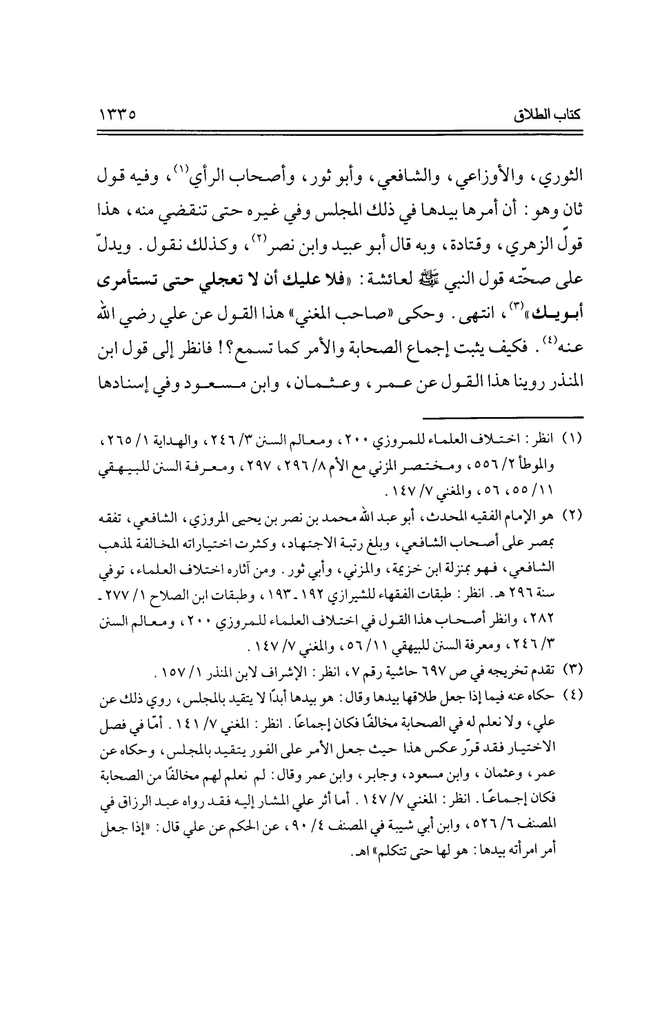 الثوري، والأوزاعي، والشافعي، وأبو ثور، وأصحاب الرأي، وفيه قول ثان وهو: أن أمرها بيدها في ذلك المجلس وفي غيره حتى تنقضي منها، هذا قول الزهري، وقتادة، وبه قال أبو عبيد وابن نصر، وكلك نقول، ويدل على صحته قول النبي -صلي الله عليه وسلم- لعائشة: فلا عليك أن لا تعجلي حتى تستأمري أبويك"، انتهي وحكي "صاحب المغني" هذا القول عن علي رضي الله عنه، فكيف يثبت إجماع الصحابة والأمر كما تسمع؟! فأنظر إلى قول ابن المنذر روينا هذا القول عن عمر، وعثمان، وابن مسعود وفي إسنادها