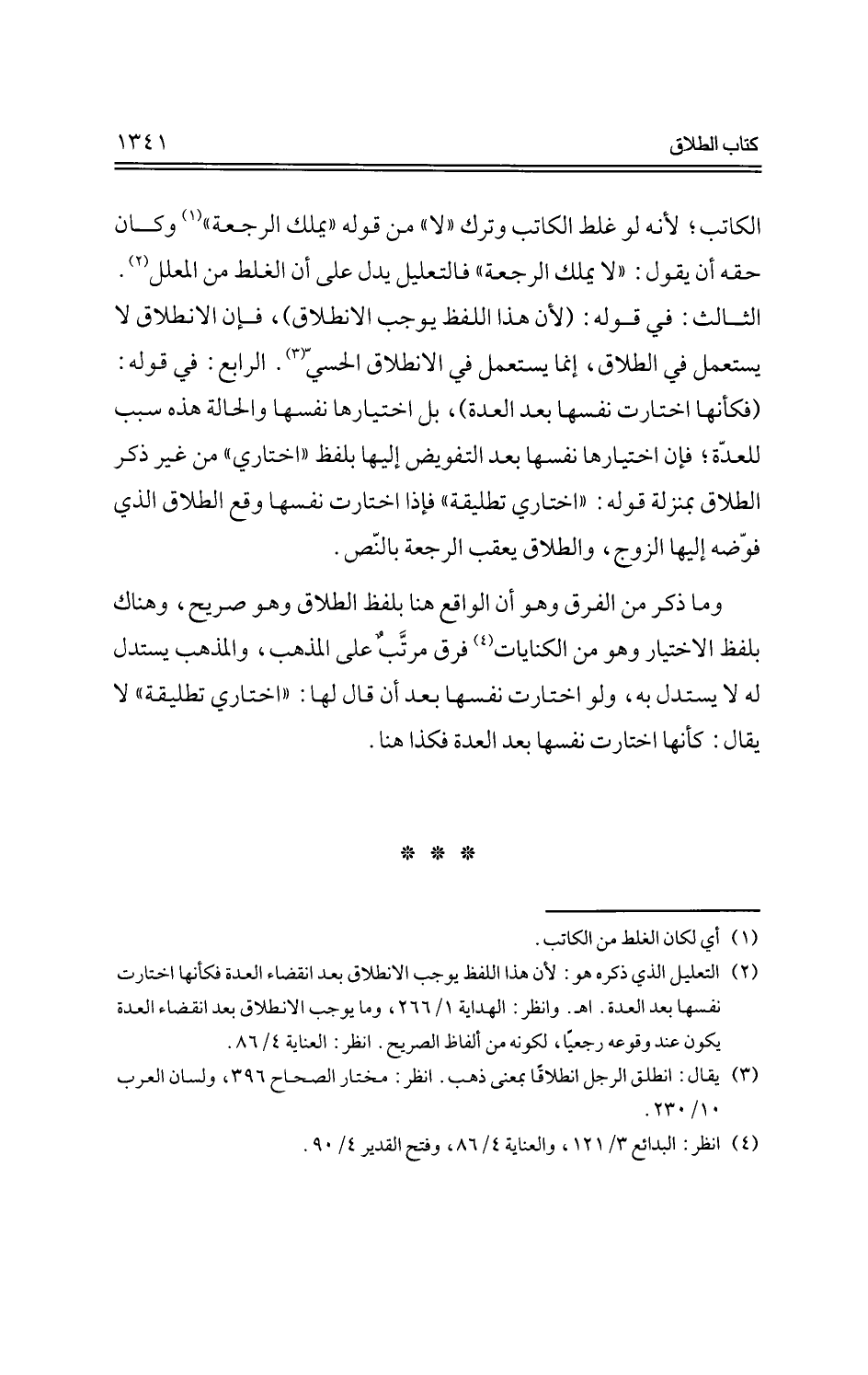 الكاتب؛ لأنه لو غلط الكاتب وترك "لا" من قوله "يملك الرجعة" وكان حقه أن يقول:"لا يملك الرجعة" فالتعليل يدل على أن الغلط من المعلل. الثالث: في قوله: (لأن هذا اللفظ يوجب الانطلاق)، فإن الانطلاق لا يستعمل في الطلا، إنما يستعمل في الانطلاق الحسي، الرابع: في قوله: (فكأنها اختارت نفسها بعد العدة)، بل اختيارها نفسها والحالة هذه سبب للعدة؛ فإن اختيارها نفسها بعد التفويض إليها بلفظ "اختاري" من غير ذكر الطلاق بمنزلة قوله: "اختاري تطليقه" فإذا اختارت نفسها وقع الطلاق الذي فوضه إليها الزوج، والطلاق يعقب الرجعة بالنص.