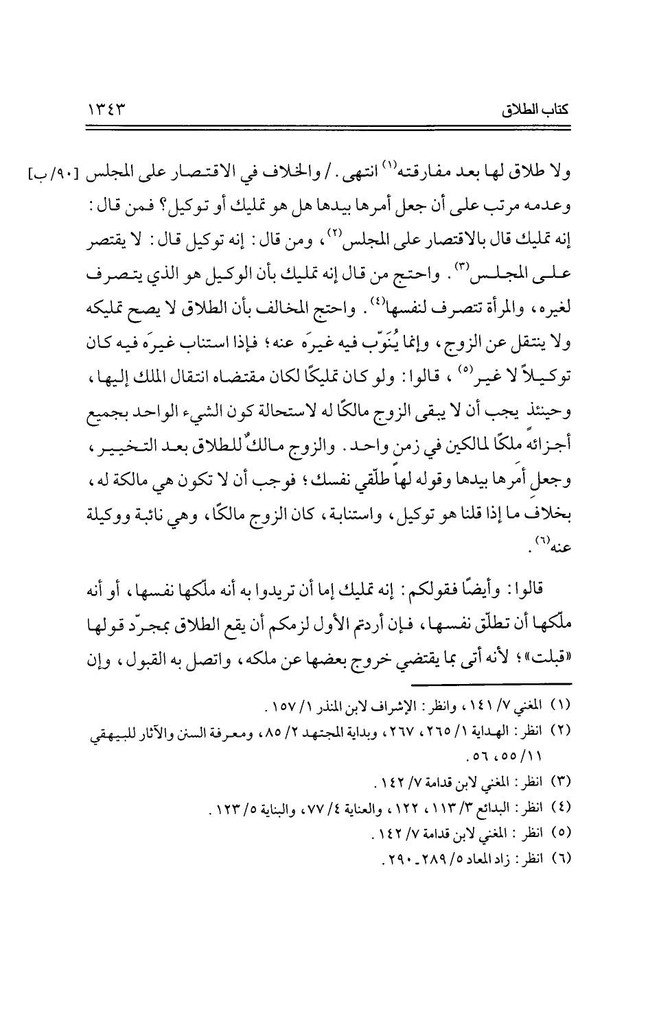 ولا طلاق لها بعد مفارقته انتهي./ والخلاف في الاقتصار على المجلس وعدمه مرتب علي أن جعل أمرها بيدها هل هو تمليك أو توكيل؟ فمن قال: إنه تمليك قال بالاقتصار على المجلس، ومن قال: إنه توكيل قال: لا يقتصر على المجلس، واحتج من قال إنه تمليك بأن الوكيل هو الذي يتصرف لغيره، والمرأة تتصرف لنفسها، واحتج المخالف بأن الطلاق لا يصح تمليكه ولا ينتقل عن الزوج، وإنما ينوب فيه غيره عنه؛ فإذا استناب غيره فيه كان توكيلاً لا غير، قالوا: ولو كان تمليكًا لكان متضاة انتقال الملك إليها، وحينئذ يحب أن لا يبقي الزوج مالكًا له لاستحالة كون الشيء الواحد بجميع أجزائه ملكًا لمالكين في زمن واحد .. والزوج مالك للطلاق بعد التخيير، وجعل أمرها بيدها وقوله لها طلقي نفسك؛ فوجب أن لا تكون هي مالكة له، بخلاف ما إذا قلنا هو توكيل، واستنابة، كان الزوج مالكًا، وهي نائبة ووكيله عنه.