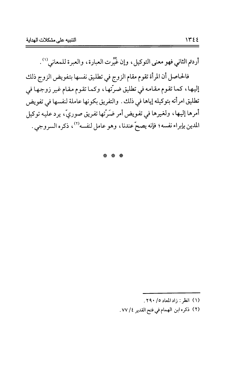 فالحاصل أن المرأة تقوم مقام الزوج في تطليق نفسها بتفويض الزوج ذلك إليها، كما تقوم مقامه في تطليق ضرتها، وكما تقوم مقام غير زوجها في تطليق امرأته بتوكيله إياها في ذلك، والتفريق بكونها عاملة لنفسها في تفويض أمرها إليها، ولغيرها في تفويض أمر ضرتها تفريق صوري، يرد عليه توكيل المدين بإبراء نفسه؛ فإنه يصح عندنا، وهو عامل لنفسه، ذكره السروجي.